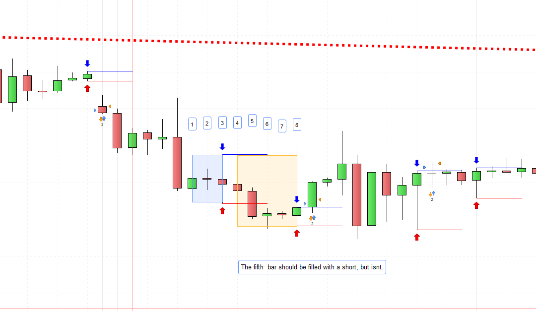 The fifth bar should be filled with a short, but isn’t. If the fourth bar breaks out it will be filled with a trade