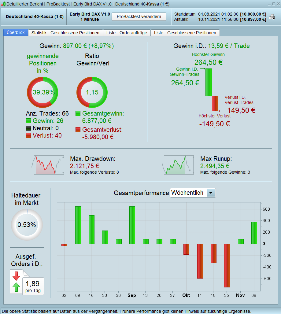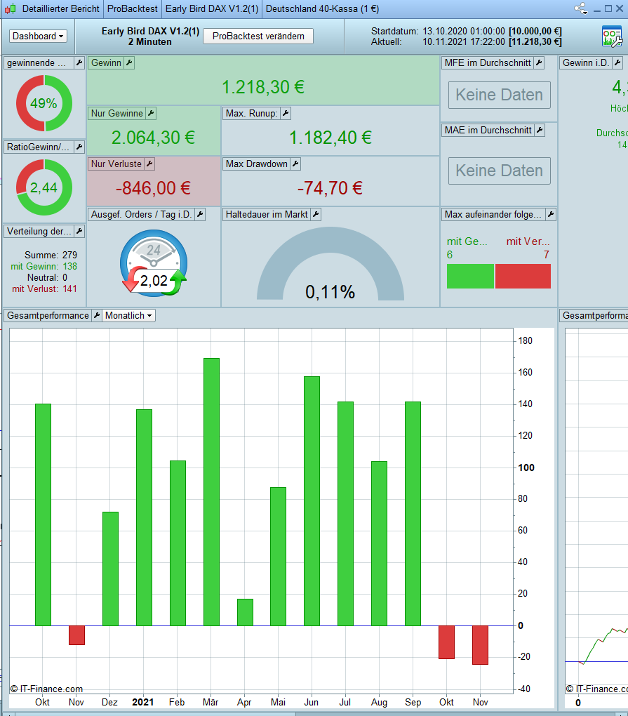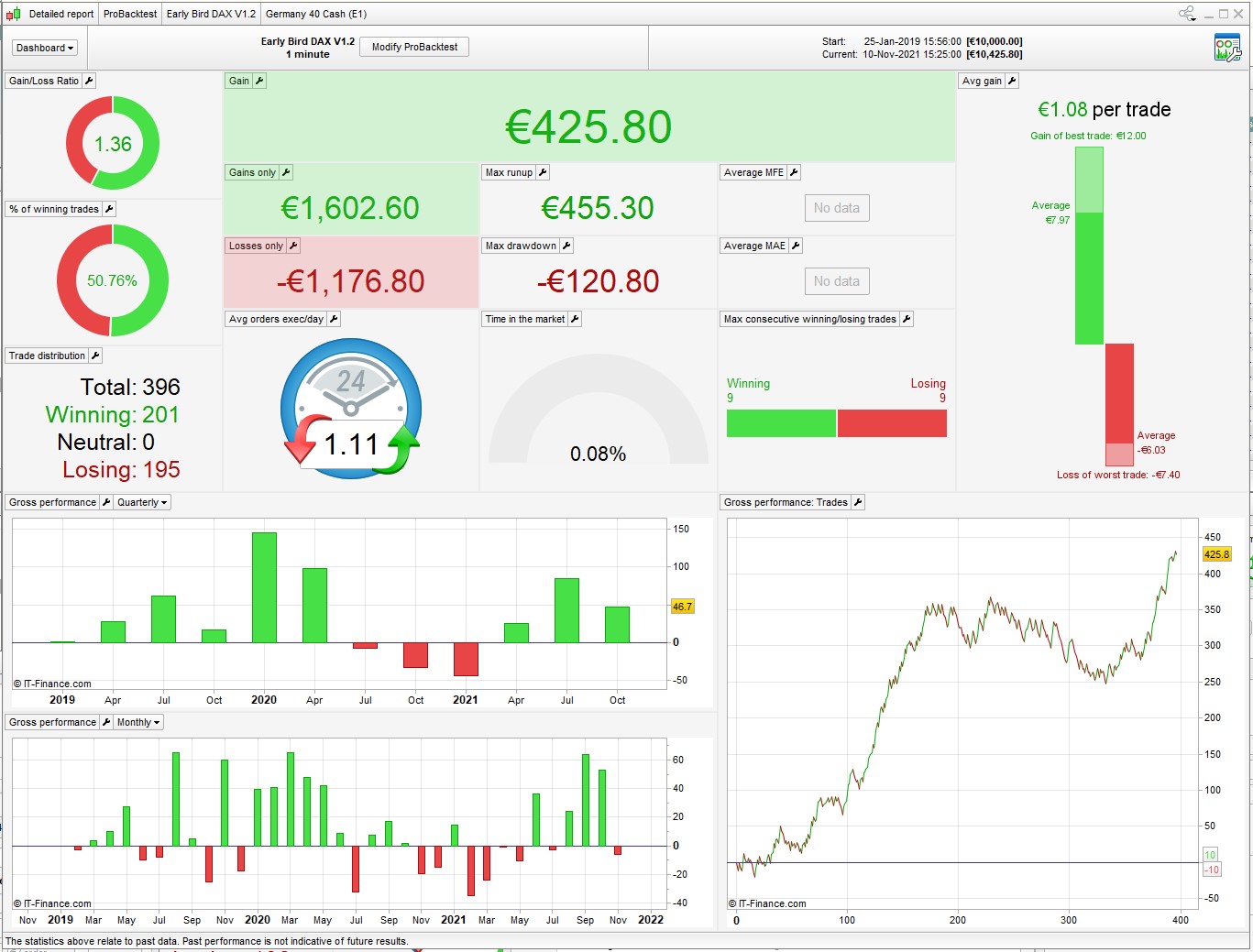 I meant something else. You invest 10 € and with a 50% hit rate you get 11 € … so one euro profit per trade. that’s not much when you consider that this is a back test and the slippage is on top of that.