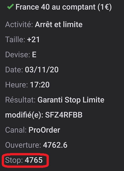 - copie d’écran de l’appli IG de mon smartphone indiquant le réajustement du stop à 17h20 (clôture bougie de 17h15 = 4811,0 avec une PV latente de 1% comme prévu dans le code)