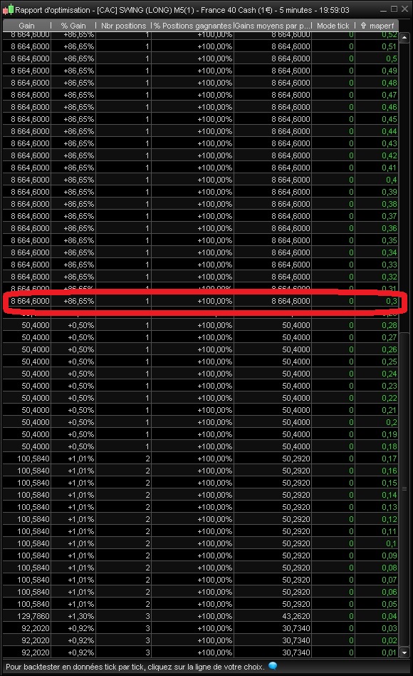 Voici en copie d’écran le résultat de l’optimisation des paramètres, en réel il aurait fallu une variable maperf au moins égale à (4865,9/4763.1-1)*100 = 2,1582 pour le breakeven ne s’active pas alors que l’optimisation montre qu’avec maperf > 0,30 cela aurait suffit ce qui est impossible car le breakeven s’est activé en réel à 1,00. Quelque chose m’échappe, je suis perdu, je dois mal m’y prendre ou bien il s’agit d’un bug, pourriez-vous regarder SVP ?