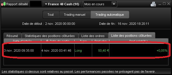 Voici par exemple ce qui m’est arrivé il y a 2 semaines sur le France 40 (1€) avec un algo qui a placé un breakeven en live sur mon compte IG dès que la plus-value latente a dépassé 1% mais qui possède un backtest où la position repasse en négatif sans considération du stop placé, puis remonte largement en plus-value