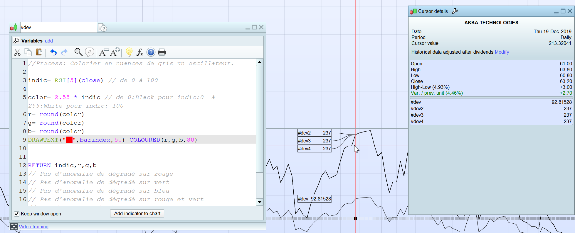 On prend un oscillateur (par exemple le RSI) que l’on colorie de Noir (RSI à 0) à Blanc (RSI à 100) et on demande un affichage dessin par exemple DrawText. (Ce pourrait être DrawPoint … ).