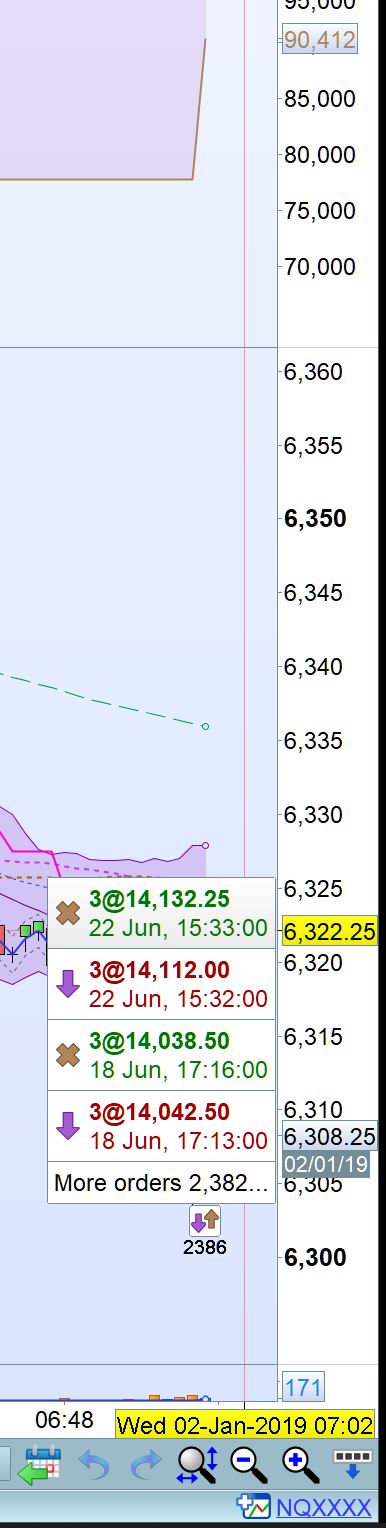 How to recognize it: if you follow the equity line displayed on the graph, it will show a spike or drop at the end. This is the change from the end of the graph to the end of the data used in calculating (e.g. jump from Jan-1 2019 to June-22 2021). The simulated future orders will also show up (combined) on the last bar with a future date on them.