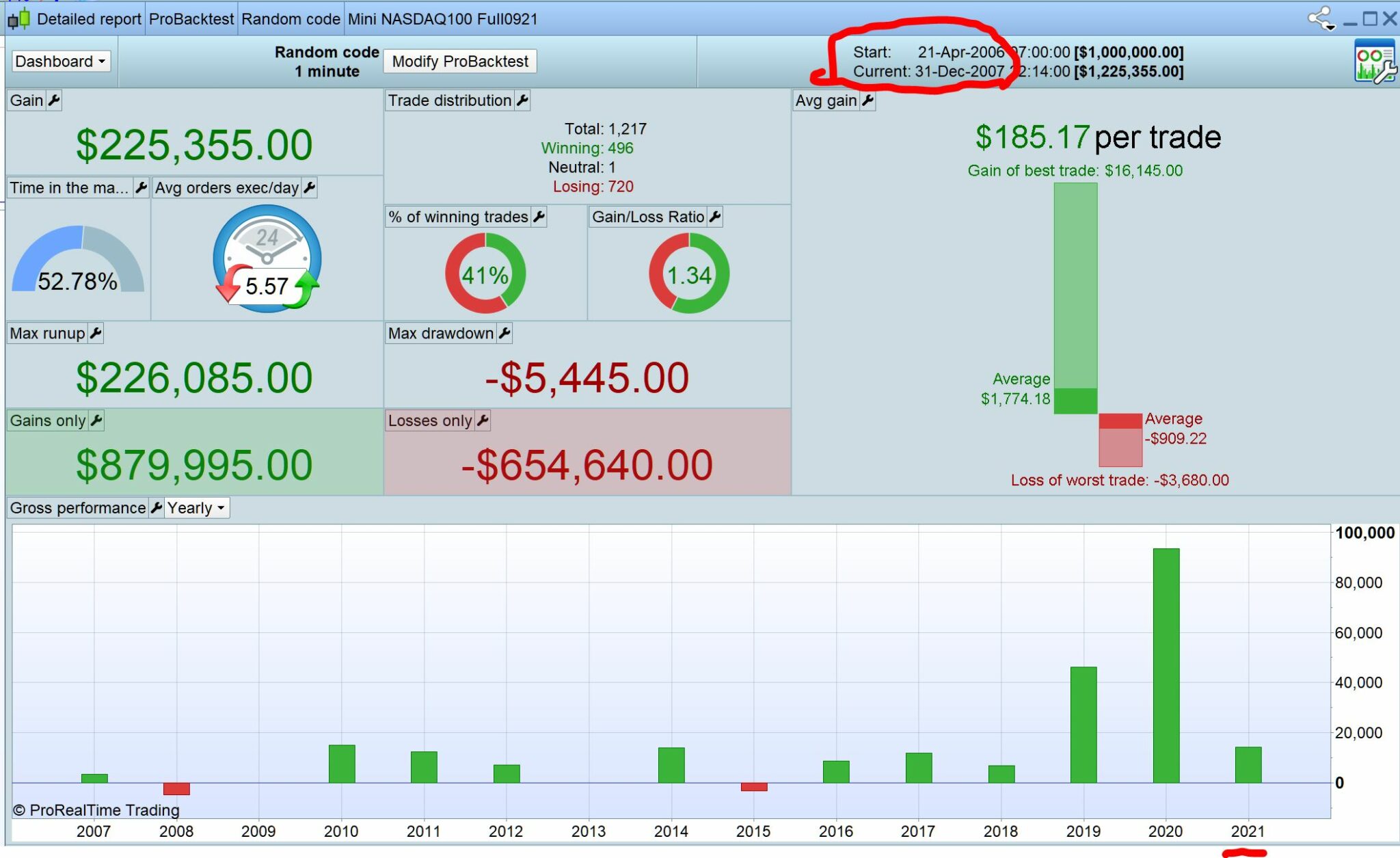 To make it even more clear: here is an image of my dashboard showing 15 years (!) of backtested results on a 1min graph from 1-Jan-2006 tot 1-Jan-2008.