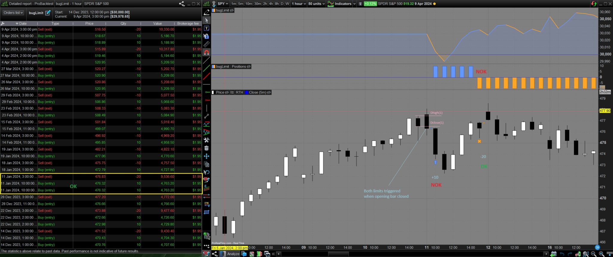 Now it goes wrong, only 1 order (10 shares buy) is executed in the proBacktest(probably because it thinks it’s the same order) meanwhile the Orders list(detailed report) knows it were 2. Then when the position is closed EOD, it sells 20 shares. Result is a -10 short position.