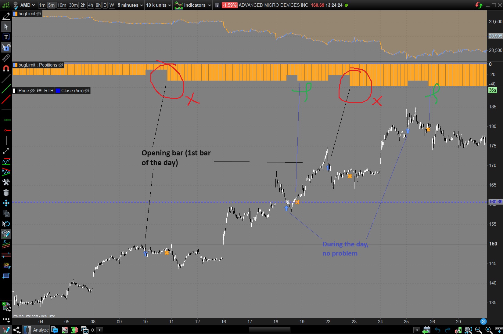 I understand that it is opened at market because both limit buy orders ended up out the money and therefor executed immediately at open. That’s fine! And is not the problem I’m describing here. (And otm limit orders are not wrong, I trade them manual all the time as alternative for MARKET orders. Is the prorealtime BUY ASK button wrong as well? )