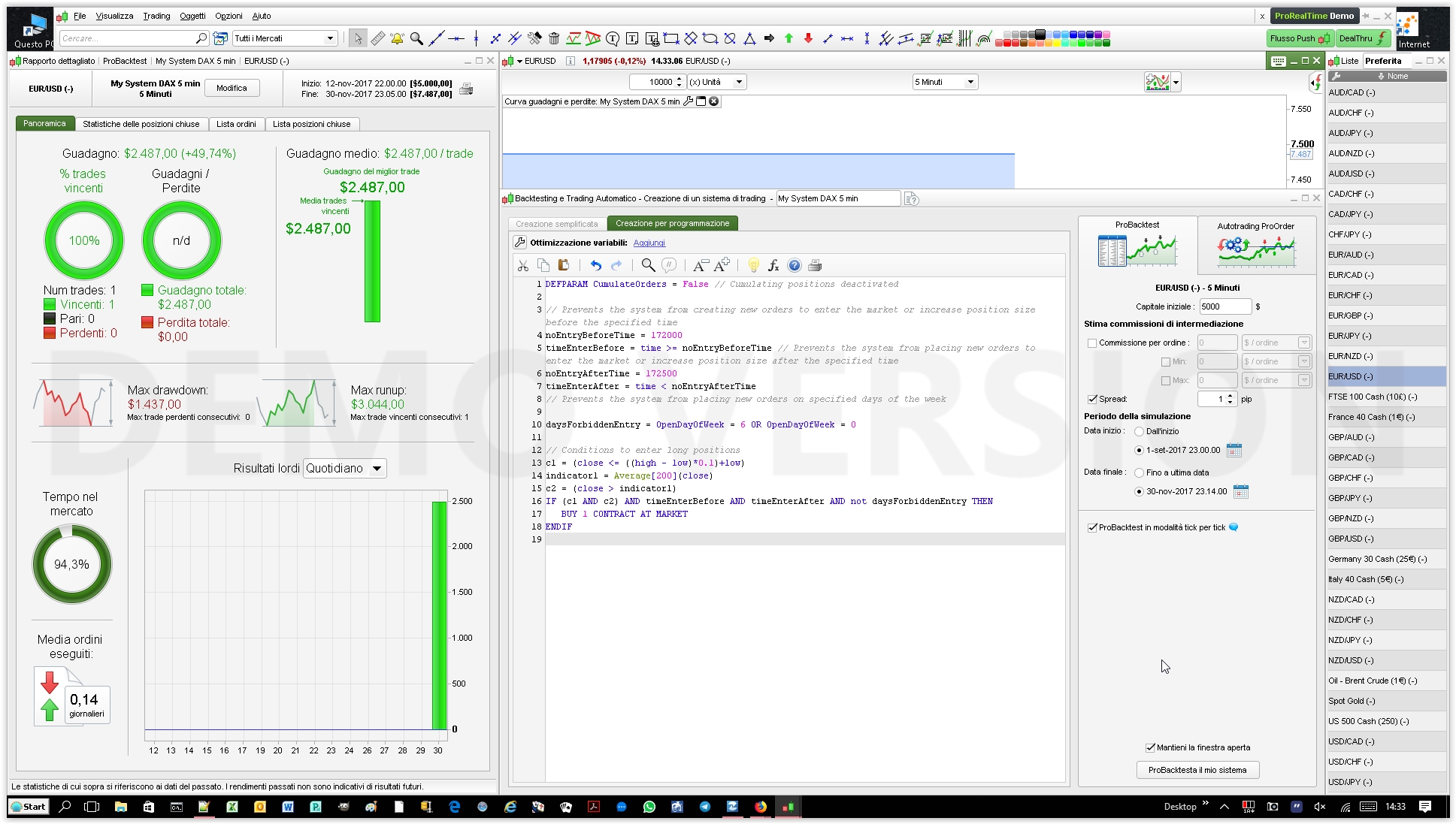 Hi, I’m very new to all of this so please excuse me =) I’m trying to write something where a buy order is executed if the price is 1/above MA200 and 2)in the bottom 10% of the days range. The problem though is that the buy gets executed the next day. I’ve set the system to be disabled all day except between 172000 and 172500 and I’m on a five minute chart. Here’s where I’m at so far, any help would be greatly appreciated.