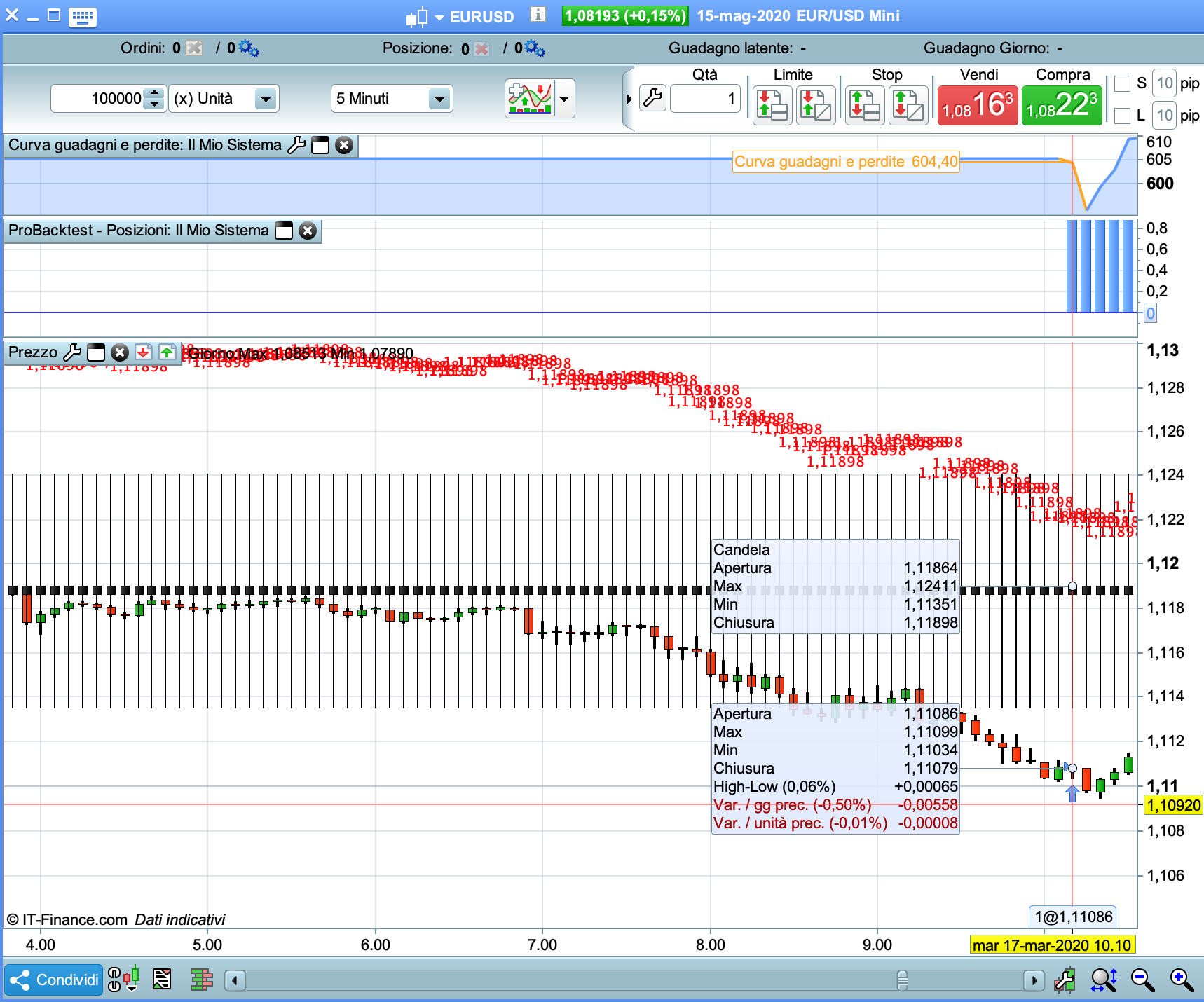 Nel caso volessi provare a backtestare uso timeframe5min con 100.000 unità su eur/usd.