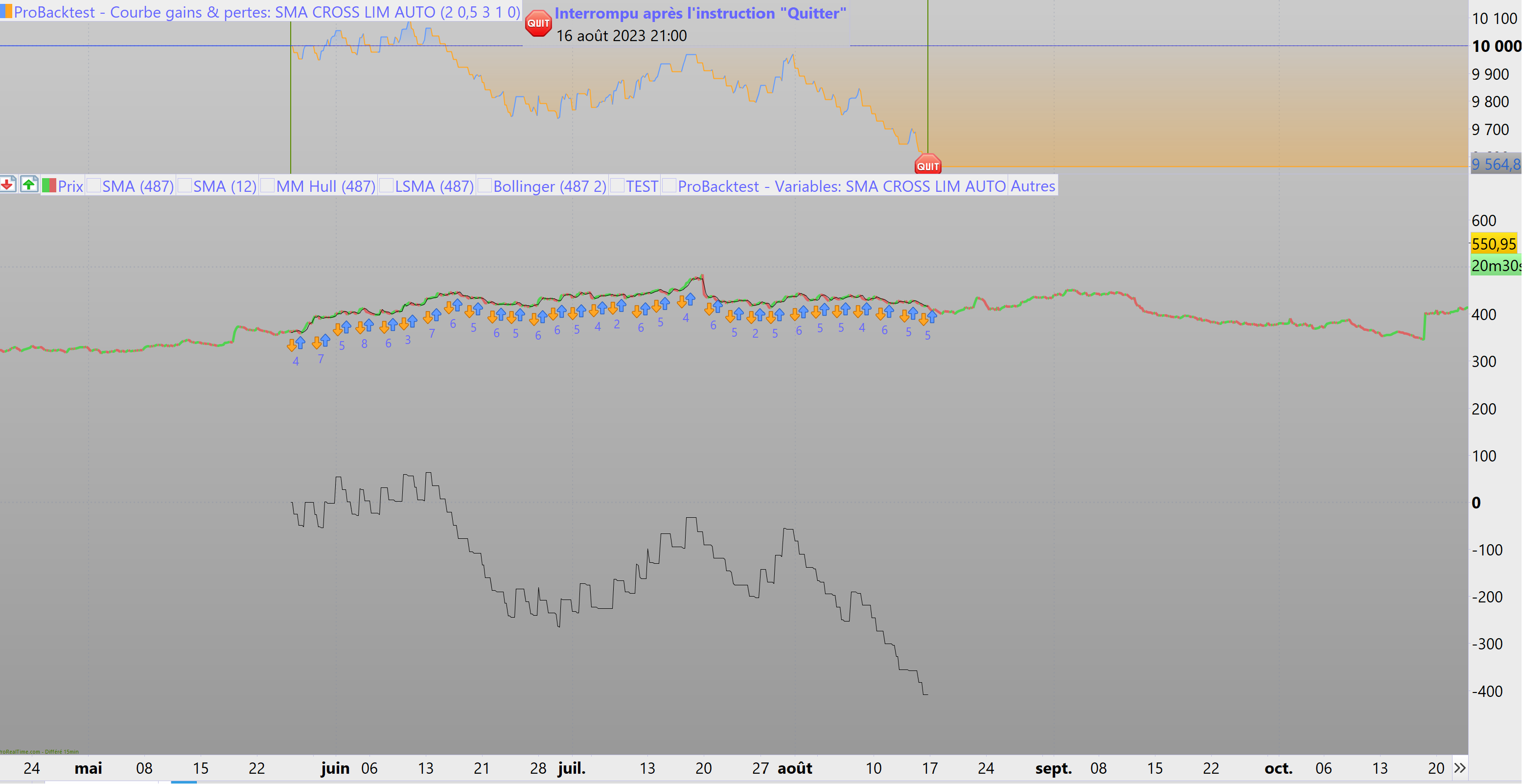 On dirait qu’il se passe deux ordres à chaque fois tandis que logiquement il ne devrait en passer qu’un seul : soit acheter (le cours dépasse la tendance) ou vendre (le cours repasse sous la tendance), les deux ne pouvant se produire simultanément, en particulier avec la formule de la “tendance magique” qui marque bien les passages d’un état achat à un état vente.