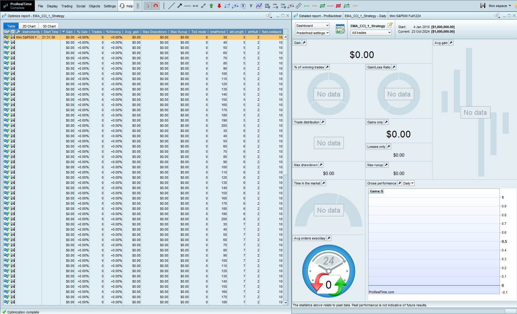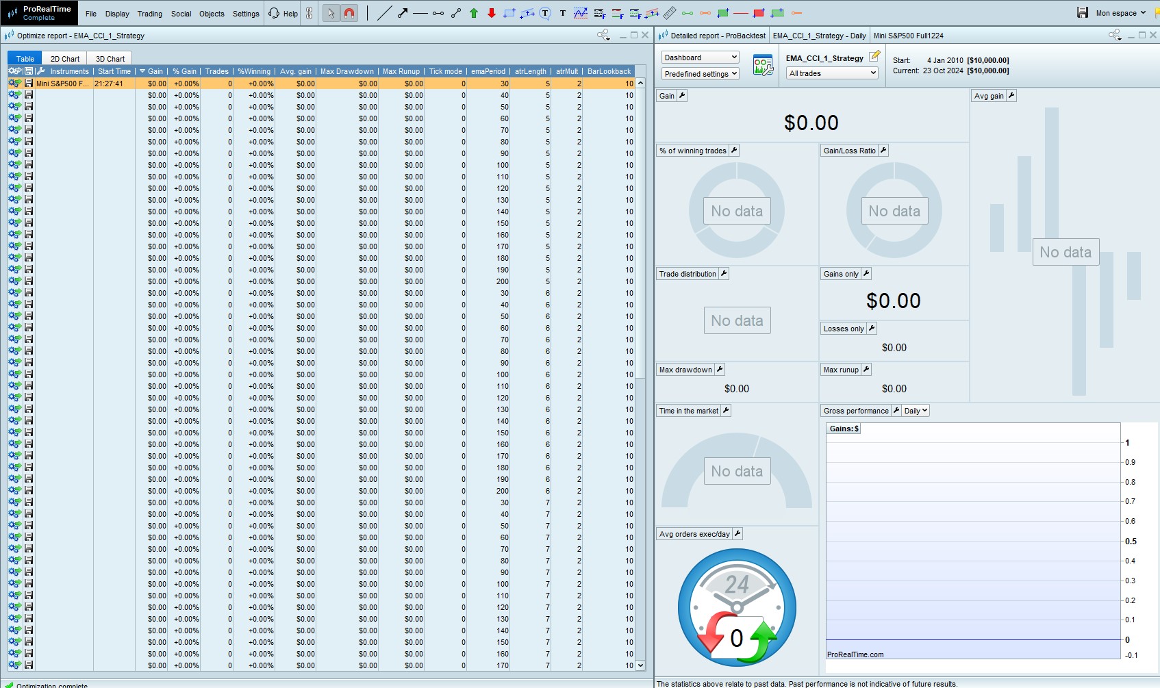 Le problème : lorsque je lance le backtest, aucun trade n’est pris sur sur l’ensemble de l’historique et cela peut importe le montant du portefeuille que je renseigne.