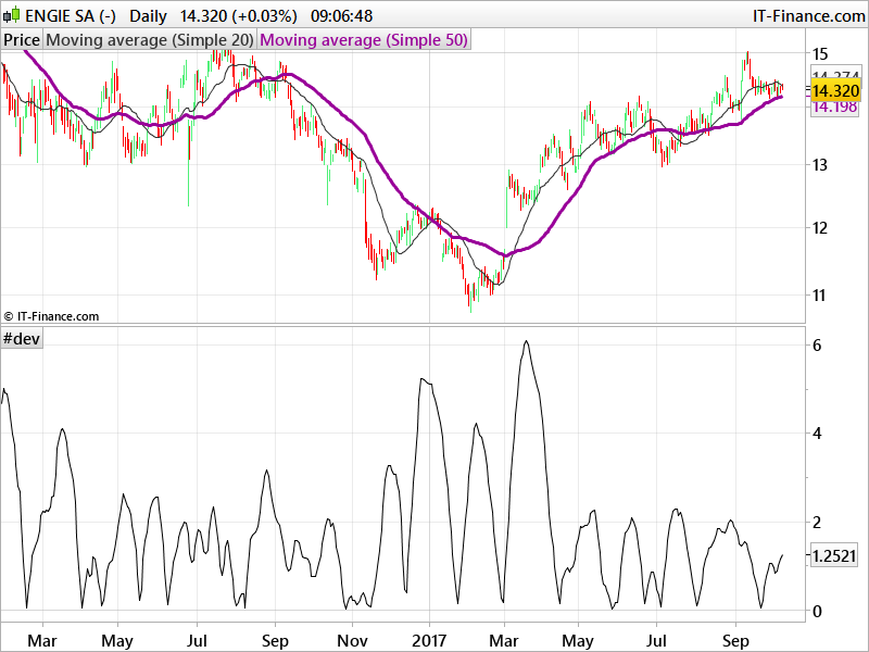 Le code que tu proposes pour calculer la vitesse entre les 2 moyennes mobiles ressemblerait à l’image ci-jointe. J’ai volontairement supprimer les valeurs négatives (momentum baissier) pour n’utiliser que l’information de vitesse. Puisque l’information est normalisée, il faudrait simplement définir un seuil pour constater que les moyennes s’écartent bien, dans le cas présent, la valeur “1” me semble être pertinente.