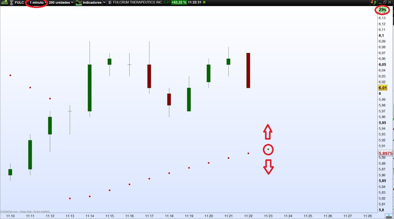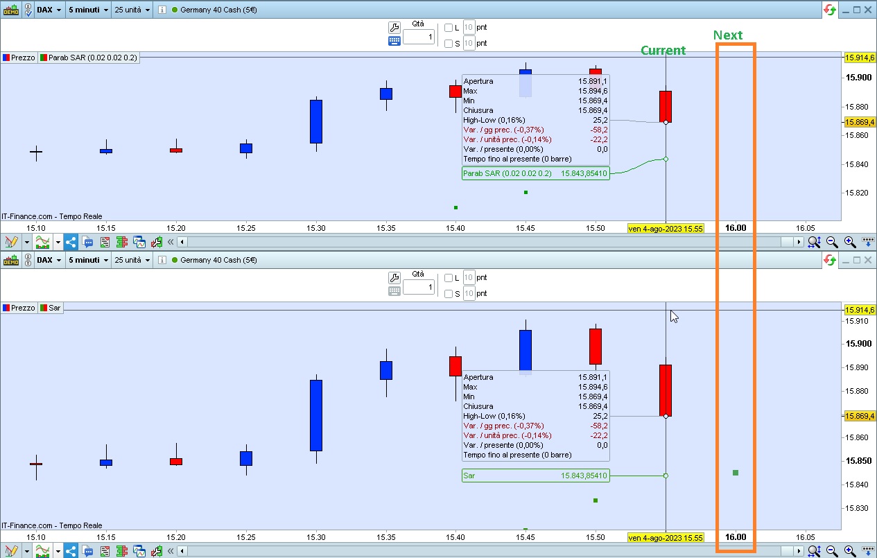 si, te adjunto las imágenes para que veas que lo que quiero es que la “sar futura” se mueva con el precio es decir según se va formando la vela, ya que se queda fija todo el minuto como puedes ver en las imagenes aunque el precio se mueve, pues lo que quiero es que vaya correlativa al precio para que averigue donde va a salir la siguiente sar ya que se calcula con el precio. Un saludo