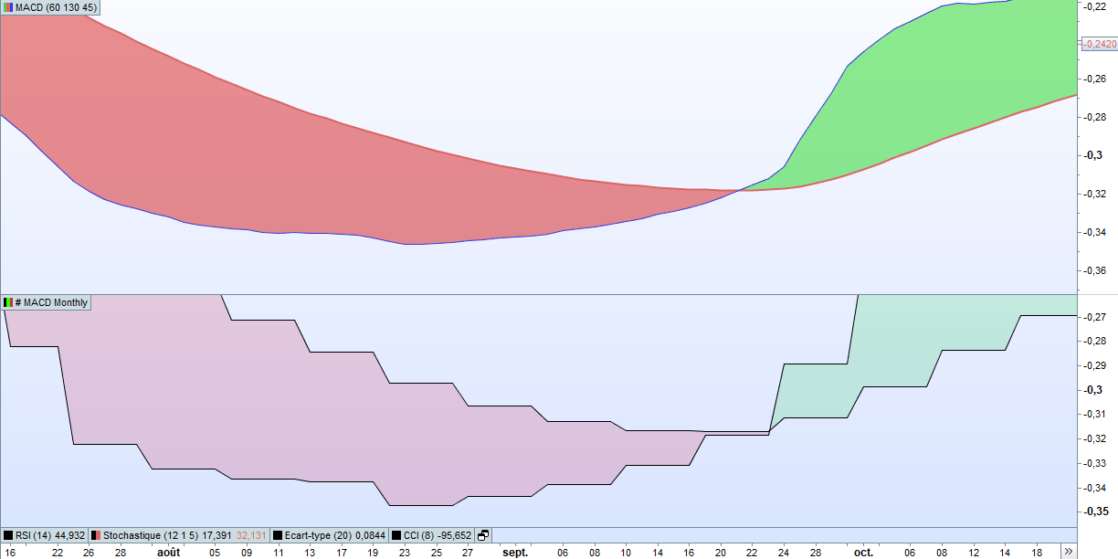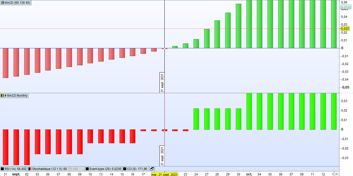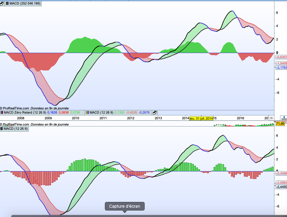 Je ne suis pas encore très à l’aise avec le logiciel pro Real time, je vous présente 2 MACD mensuel, le mensuel est en bas, et le mensuel avec des bougies journalières en haut, j’ai l’impression que c’est les mêmes, pourrais rencontrer le problème de l’équipondérée dans cet exemple ?