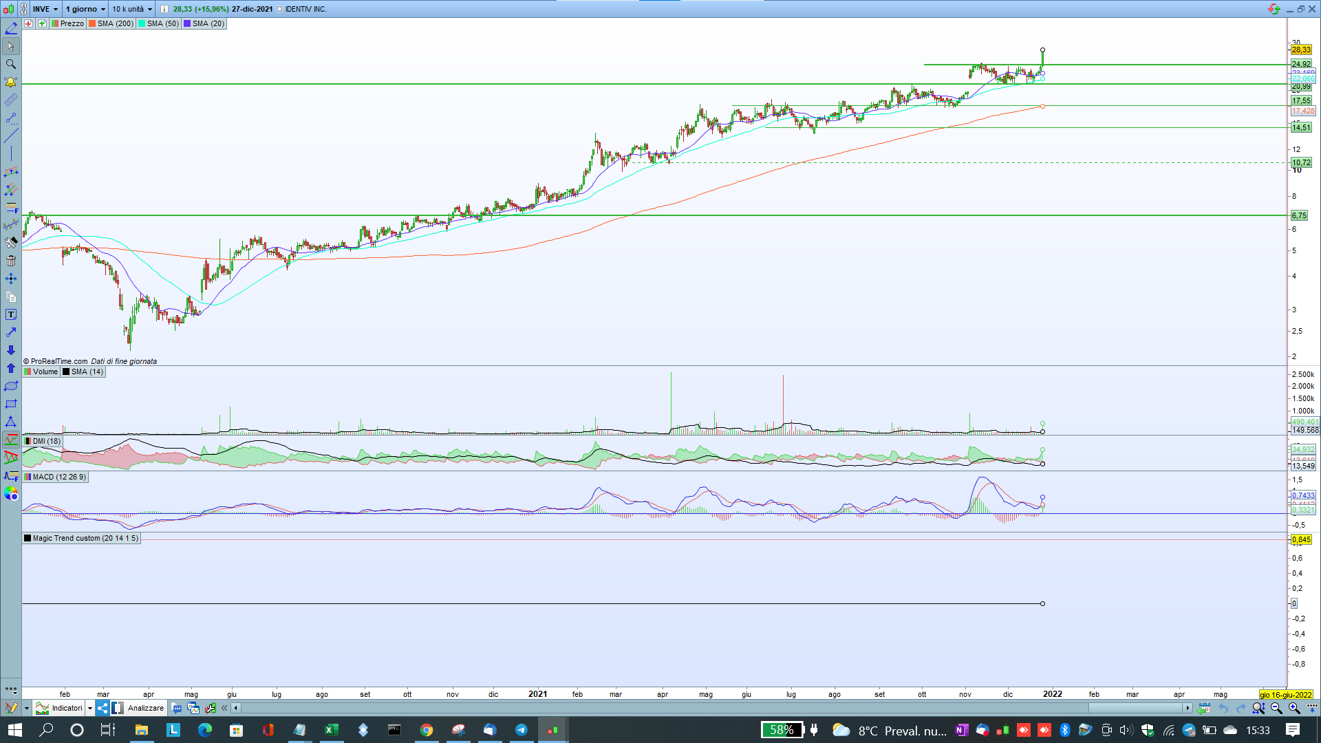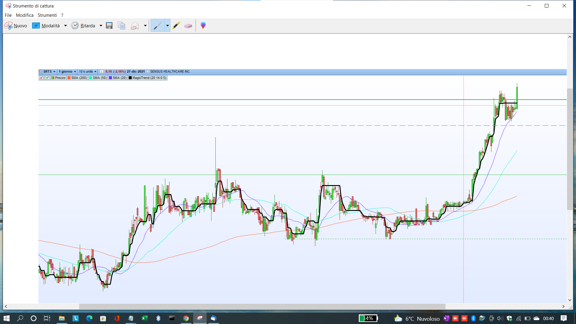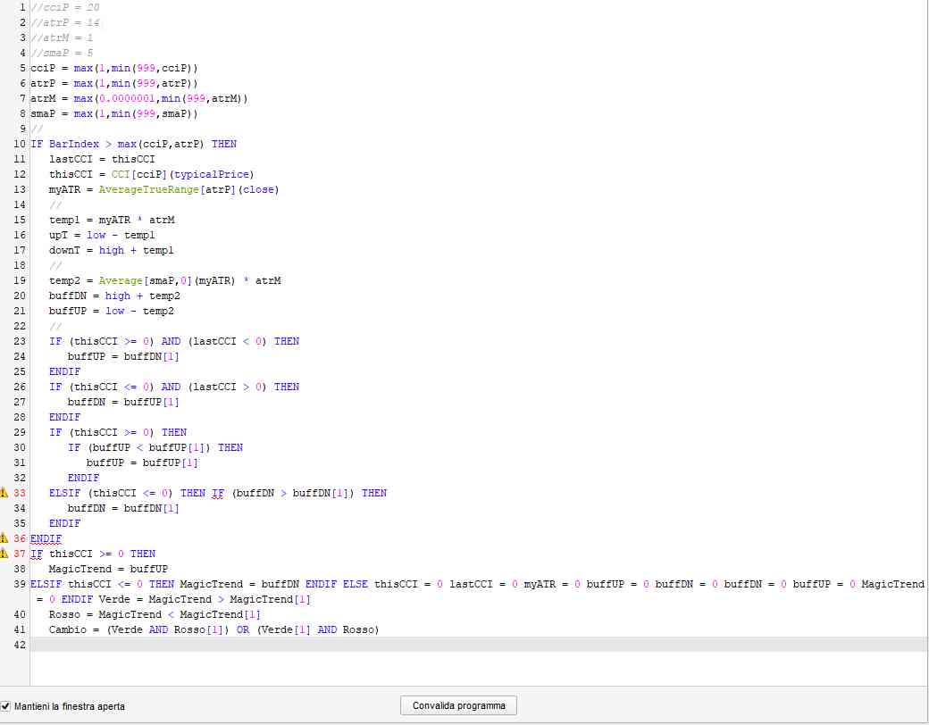 Comunque quello che hai postato non mi pare sia lo stesso che è sul grafico, perché questo NON ti fa vedere il Magic Trend, ma solo il cambio, mentre sul grafico c’è la linea nera dell’indicatore vero e proprio.