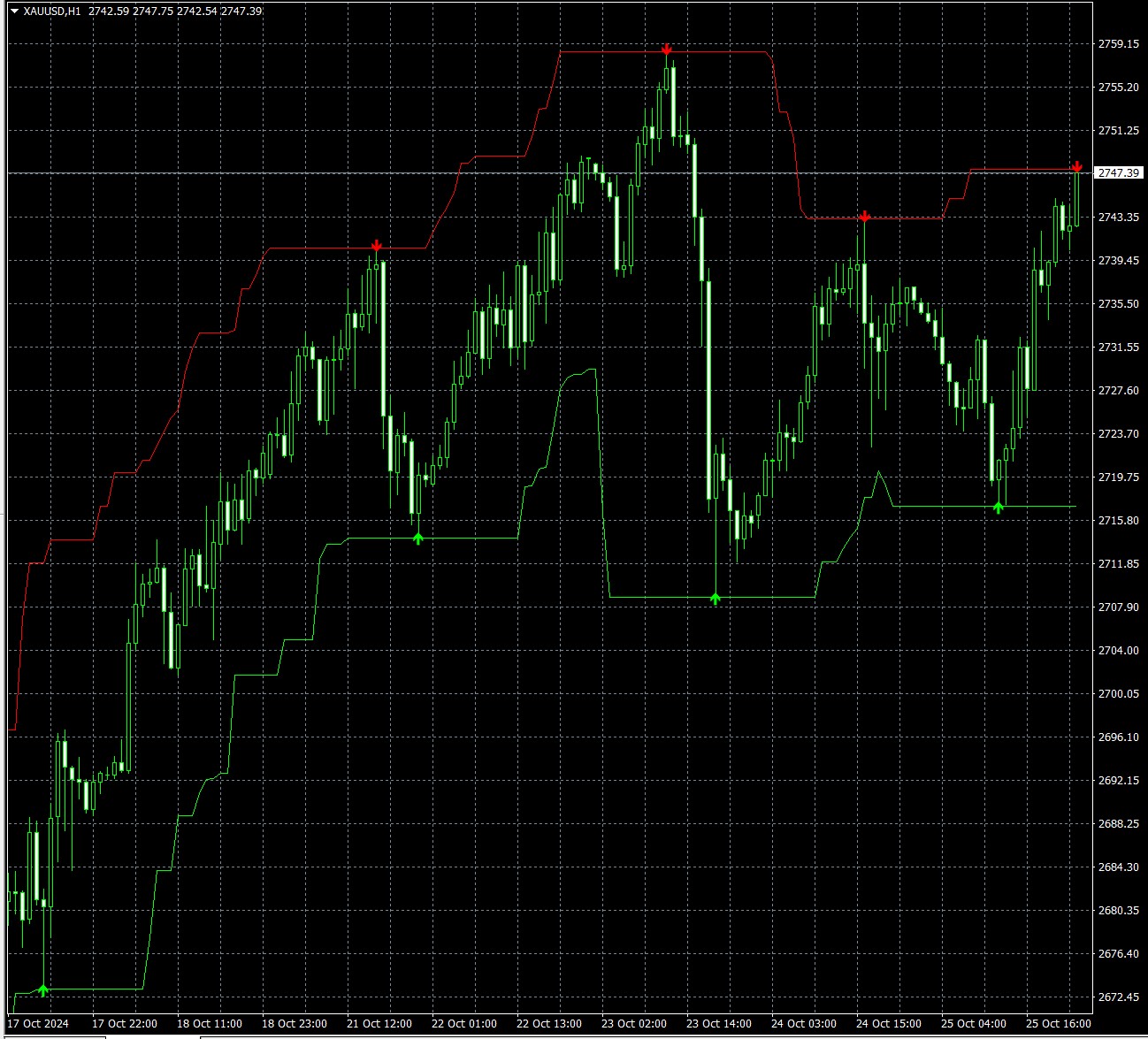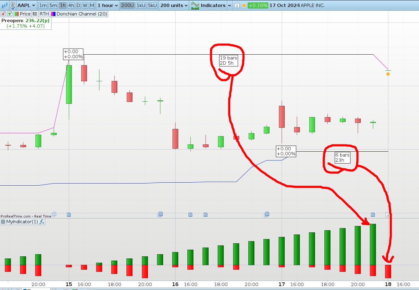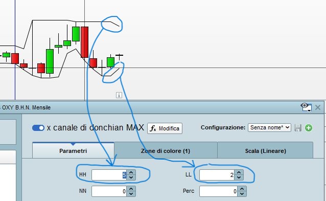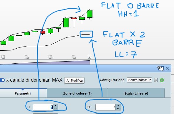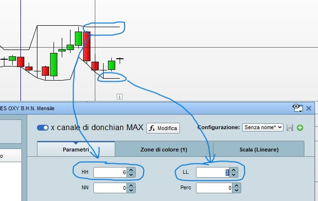 Non riesco a segnartelo sul grafico da te allegato, anche perchè le linee del canale di donchian che voglio vedere si impostano in base agli alti/bassi dell’ultima candela, quindi cambiano in continuazione.