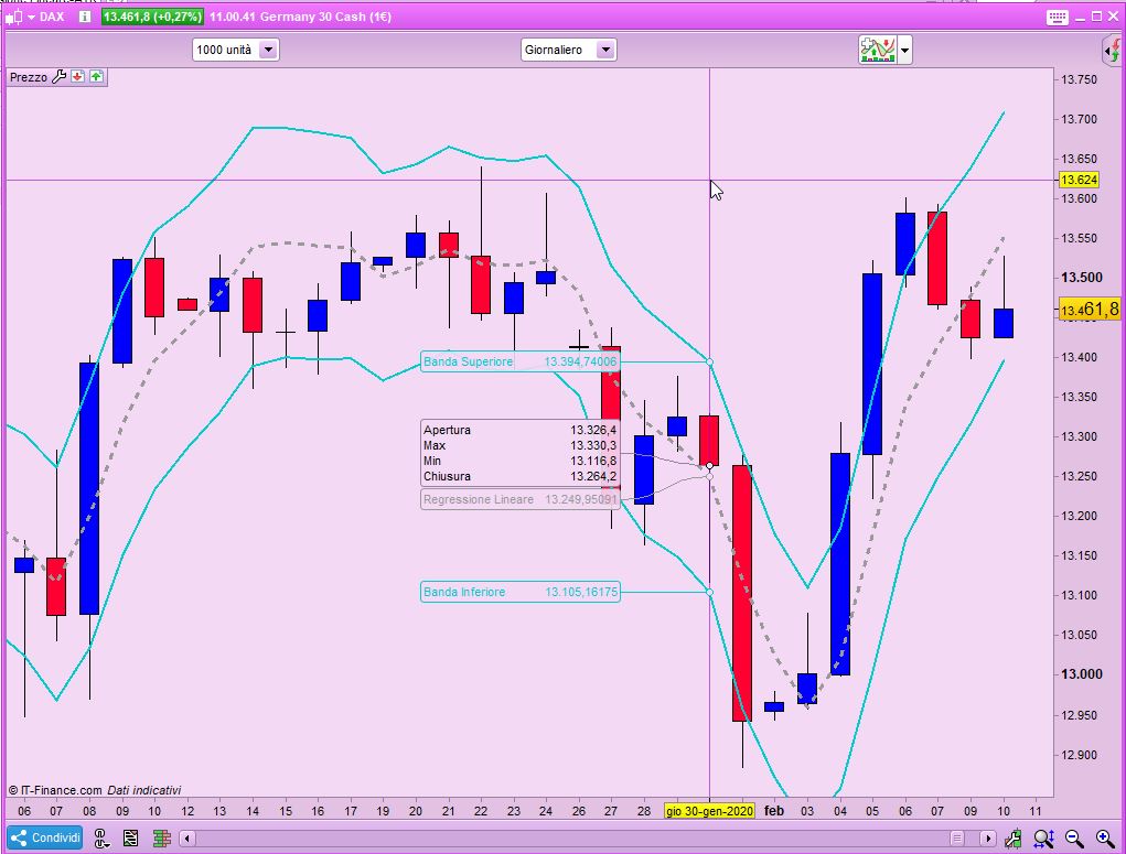 Gent.mo Roberto, se volessi creare un canale applicando alla regressione lineare invece che l’ATR 2 deviazioni standard come dovrei fare? In modo da riproporre più o meno il canale dell’immagine allegata, canale che rimane più stabile nel senso che non segue i prezzi come ad esempio fanno le bande di bollinger.