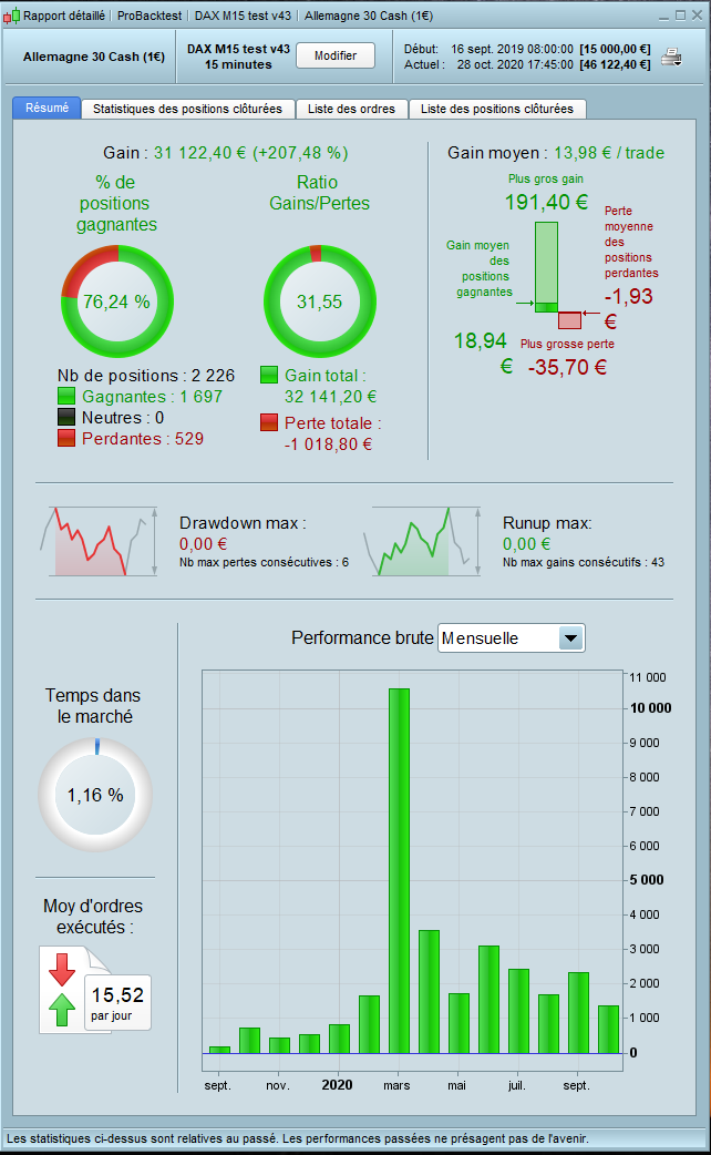 Variables have obviously been over-optimized for DAX 15 minutes 1€ with IG CFDs. WF provides a relatively high result… Not sure how this will work in live trading.