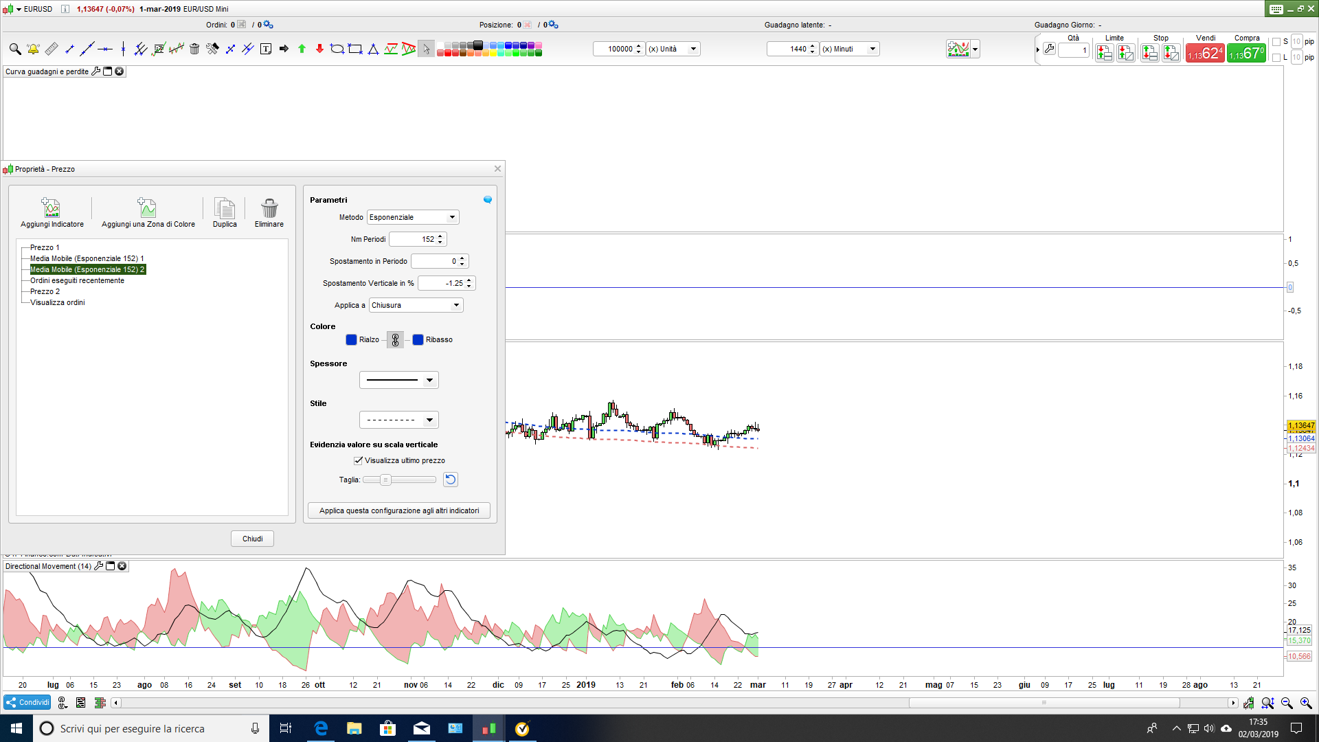 In realta’ le medie mobili che ho utilizzato sono m.m.esp. 152 scost. vert. -1.25 e la seconda idem con scost.vert. -1,8 entrambe giornaliere.