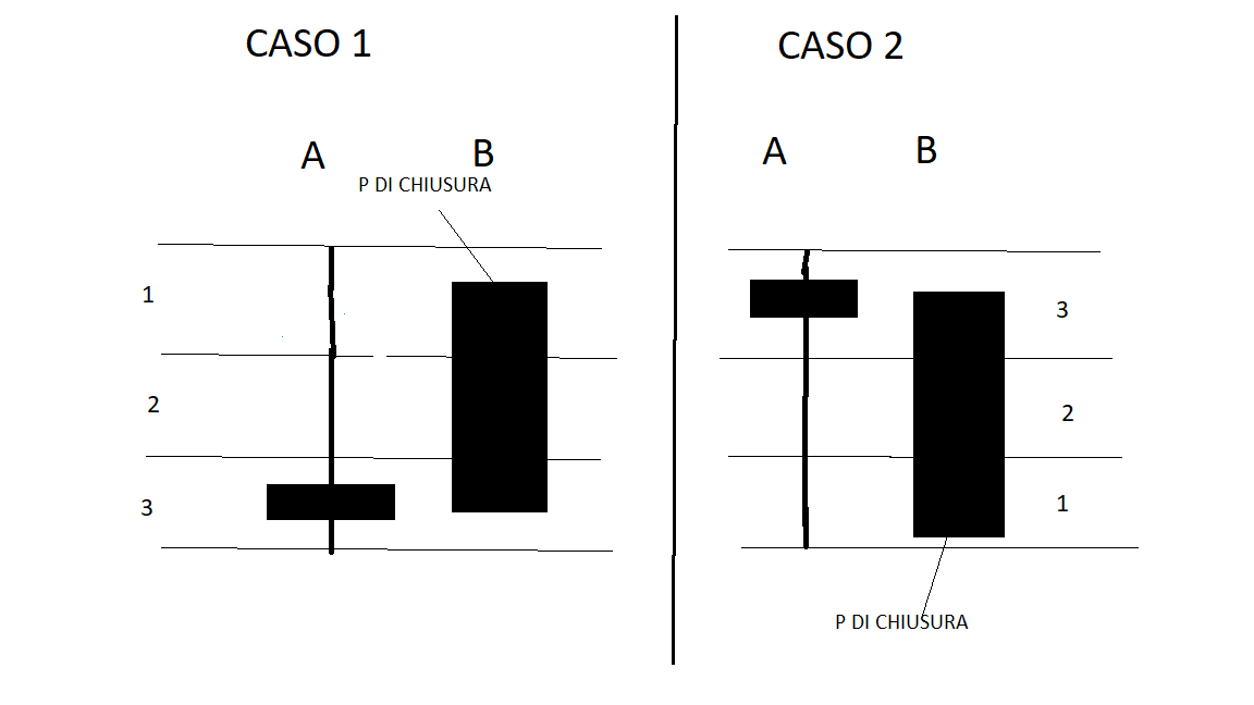 - Nel CASO 1 (quindi penultima candela rialzista o ribassista, a prescindere…ma con il corpo nel terzo INFERIORE della candela stessa) deve avere il P di chiusura nel terzo SUPERIORE(più alto) della penultima candela.
