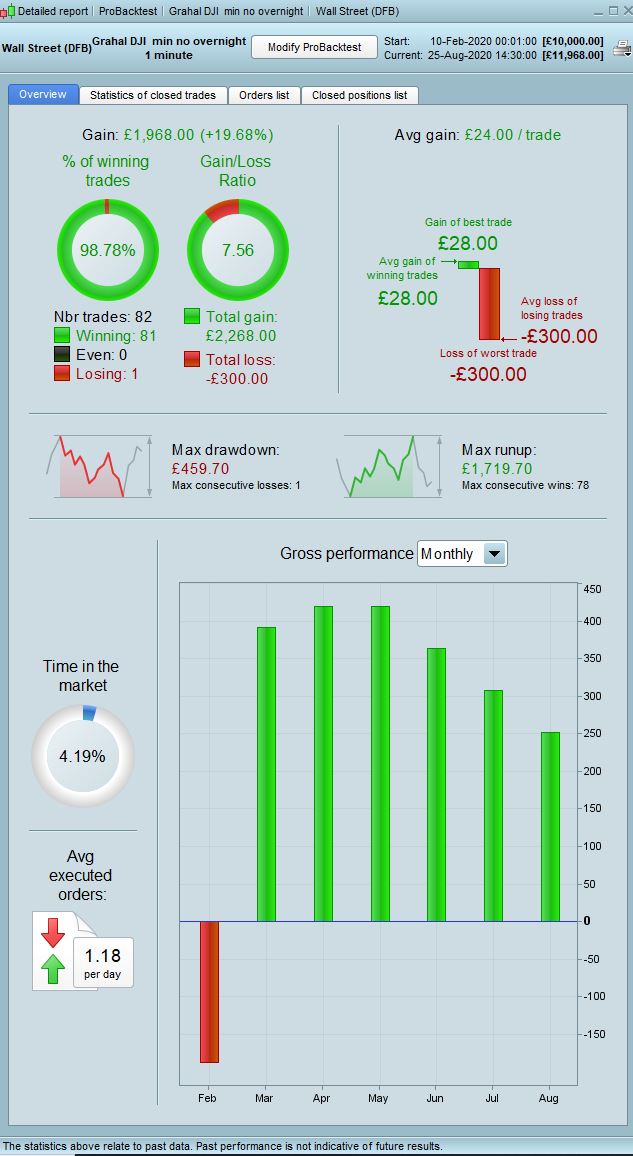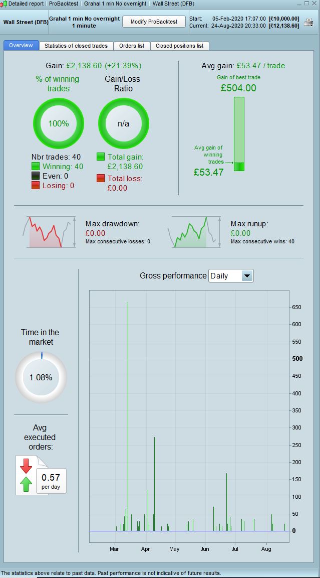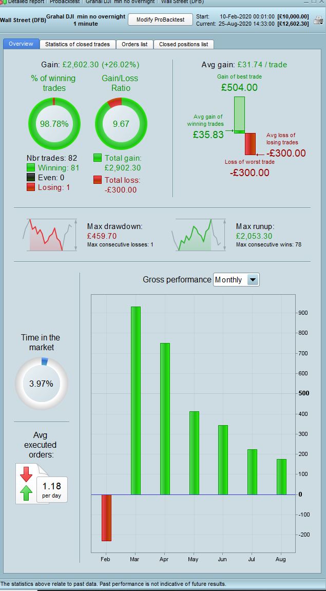 The no losses was the 1 minute version with a c21m of >=16 or 17 with a TP of 28 – stoploss as normal. Time limit of 0700 to 2055 if I recall correctly. I’ve got that on a minimal trade live with fractional percentage stoploss so iget some pennies if it runs ok an dcan start to build up the risk free trading..