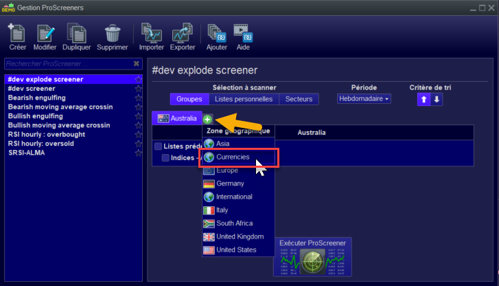If you are using the new version prorealtime version 11, click on the + symbol in the ProScreener window and choose Currencies (look at attached picture).