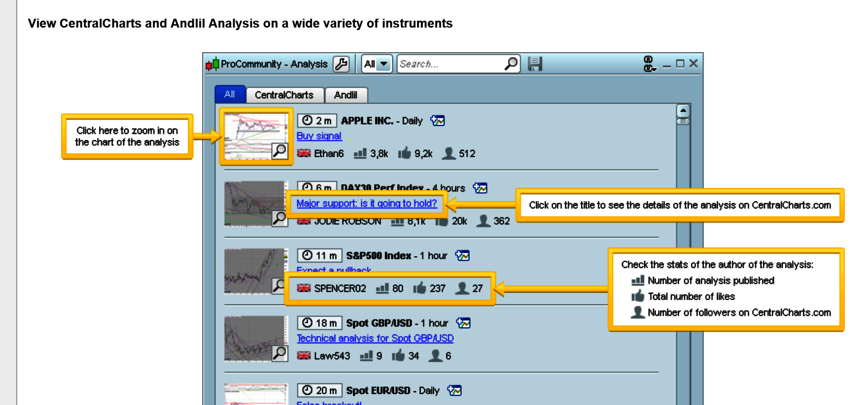 This feature allows to receive market analysis on instruments of your choice and publish your own analysis directly via the ProRealTime platform.