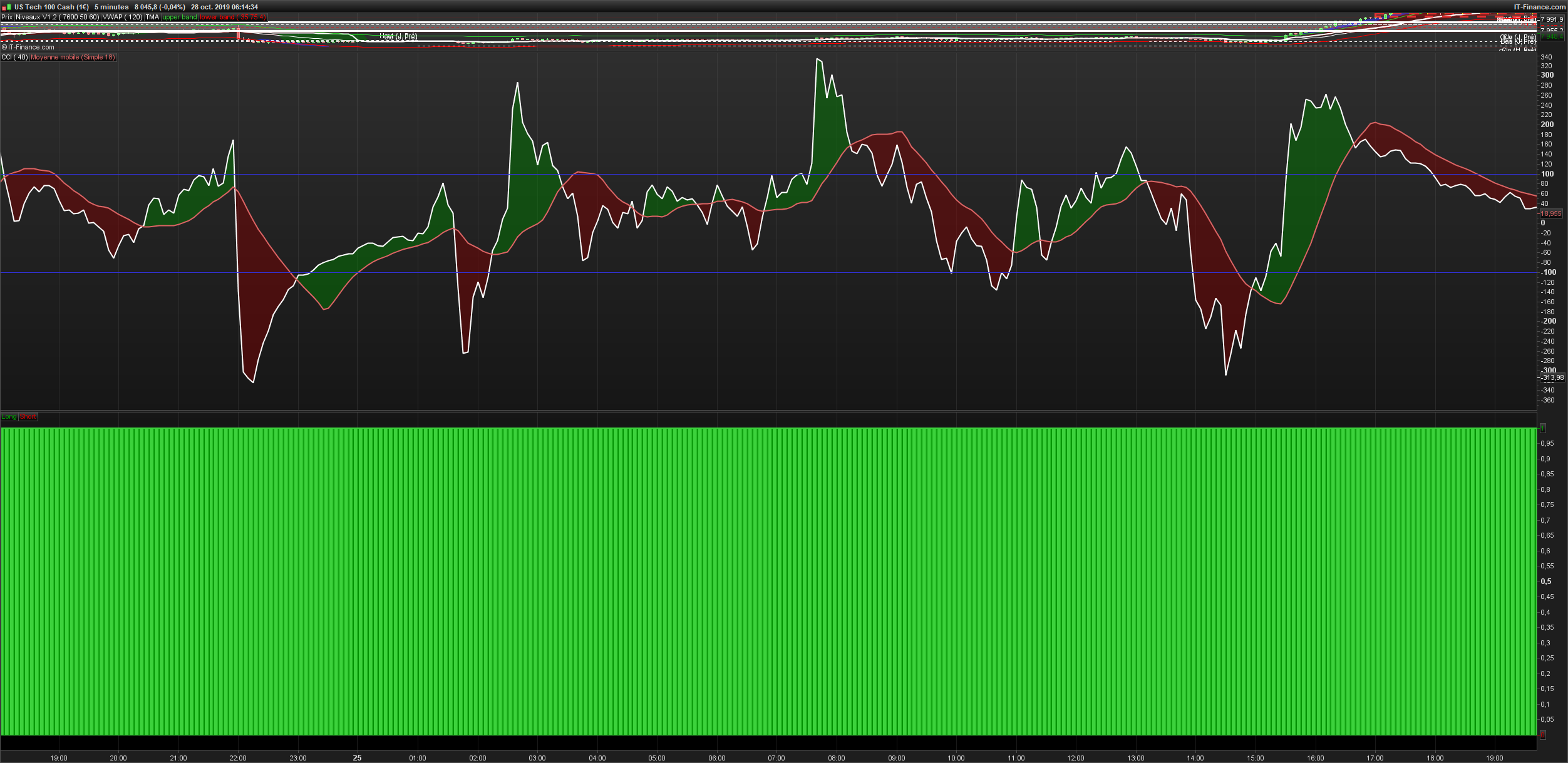 Attention toutefois, j’ai codé les conditions comme tu les a énoncé et j’ai un doute sur la condition “short”, tu as mis une fonction OU entre la condition du prix vis à vis de la moyenne mobile et celle sur le CCI. Par ailleurs celle sur le CCI teste un croisement sur le niveau 100, alors qu’il devrait s’agir du -100 non ? Bref, je te laisse analyser.