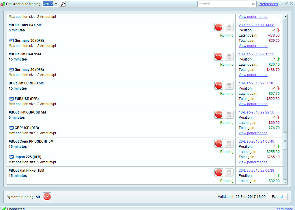 Re the window shown below … it is very inefficient, frustrating and time wasting to see which Auto-System (ATS) is showing the best % of winning trades, gain / loss ratio, max drawdown etc etc. I have to click on the View Performance button and then make notes! I have 100 ATS running and so this process has to be repeated 100 times and even then I am left with a whole muddle of notes to decypher. Then in a few days / 1 week this whole process has to be repeated! The ‘PRT toolset’ is generally good, but lack of an effective ‘finishing off / analysis tool’ is making me feel like giving up with Auto-Trading altogether!