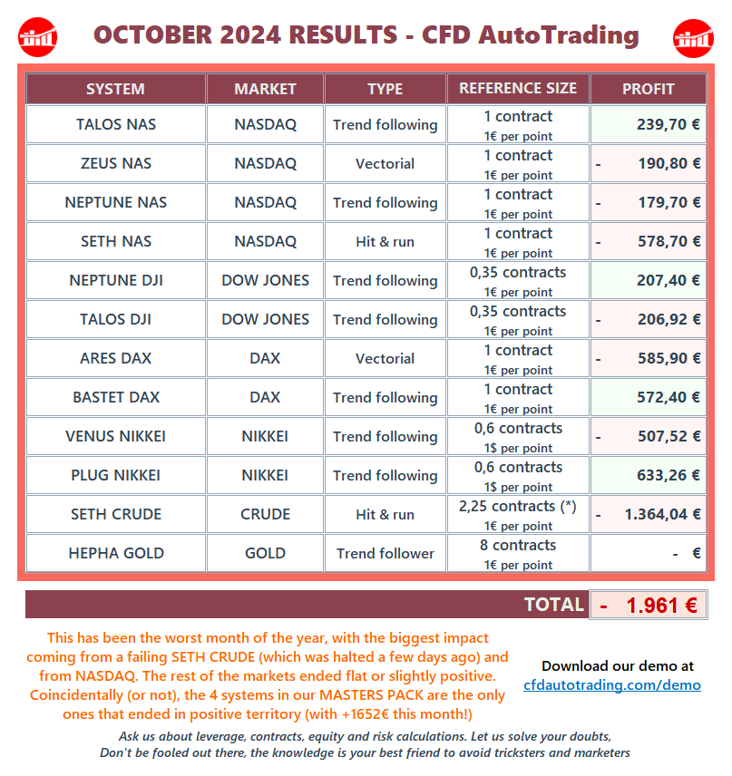 PS: The September results had another error on NEPTUNE DJI system, finally the month closed with +862€. We had a problem with my own instances in real, from where the results are extracted. More details in our Discord: https://bit.ly/cfdautodiscord