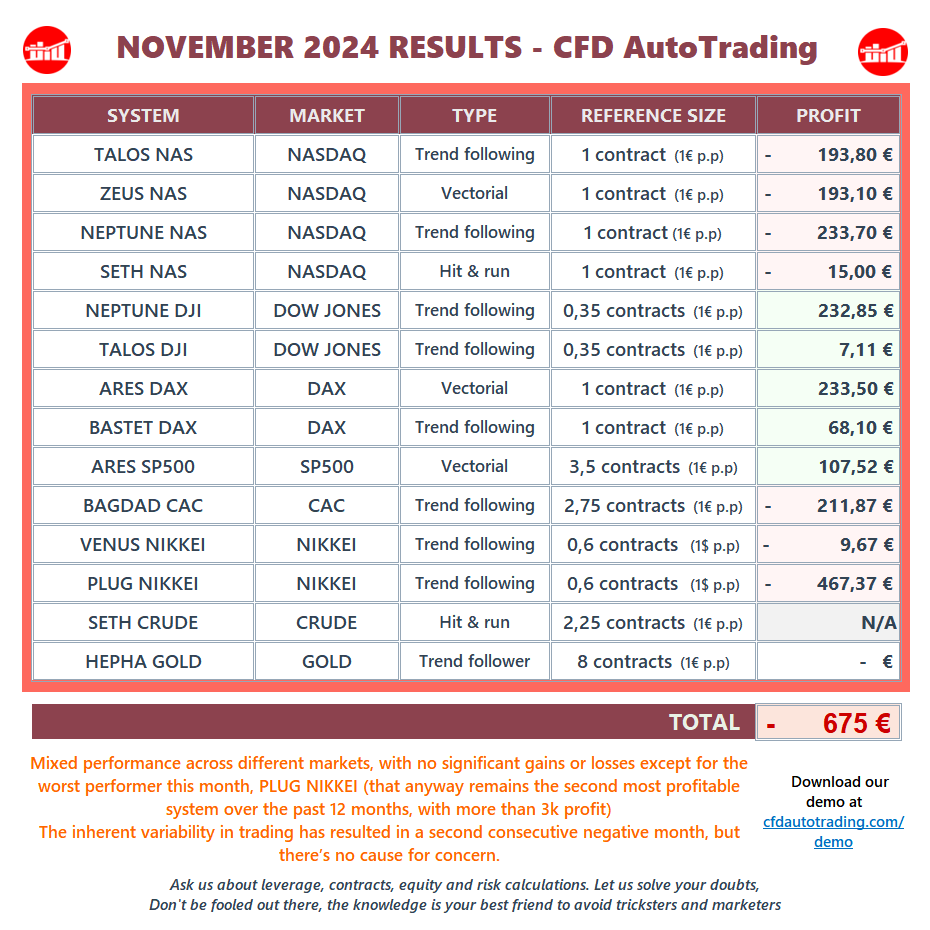Focusing on November, the month saw mixed results across markets, with no significant gains or losses except for PLUG NIKKEI, which underperformed. Despite this, it remains the second most profitable system over the past 12 months, with over 3.000€ in total profit. Another example is the four systems in the NASDAQ PACK: after a setback of 1.345€ in October and November, they still hold a strong 12-month profit of 9.200€.
