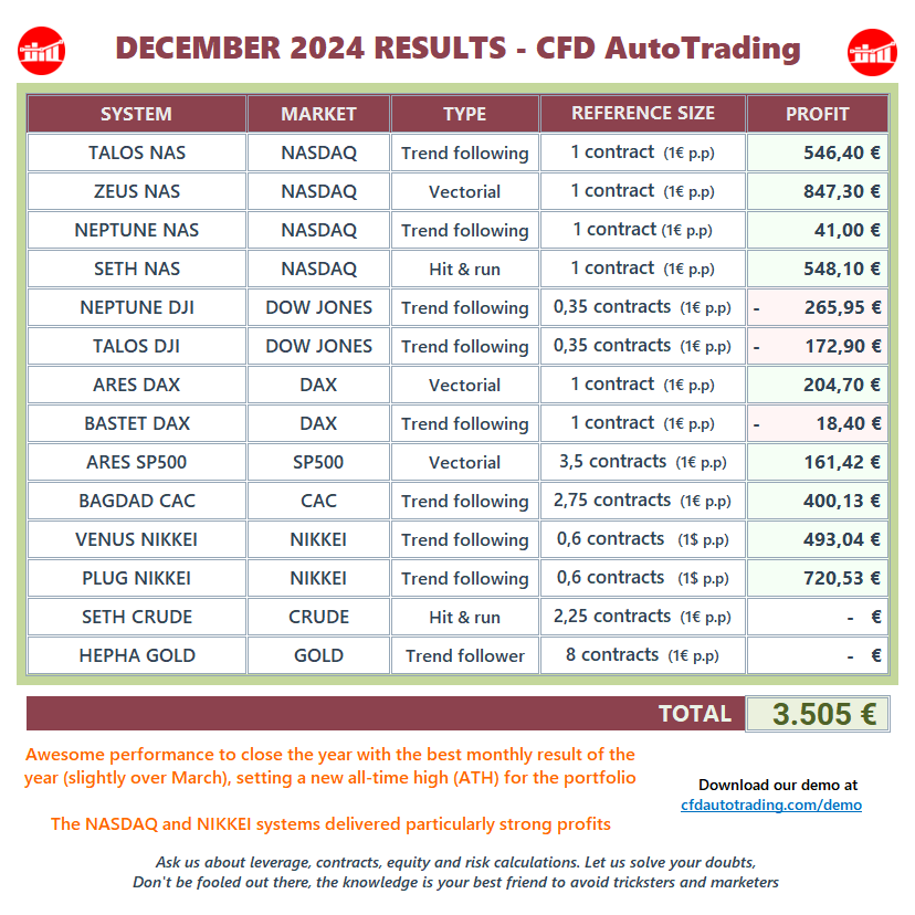 This December delivered an outstanding performance, closing the year with the best monthly result of 2024—slightly surpassing March—and achieving a new all-time high (ATH) for our CFDAutoTrading standard systems portfolio. The month generated an impressive 3.505€ in gross profit, with the NASDAQ and NIKKEI systems standing out as top-performing markets.