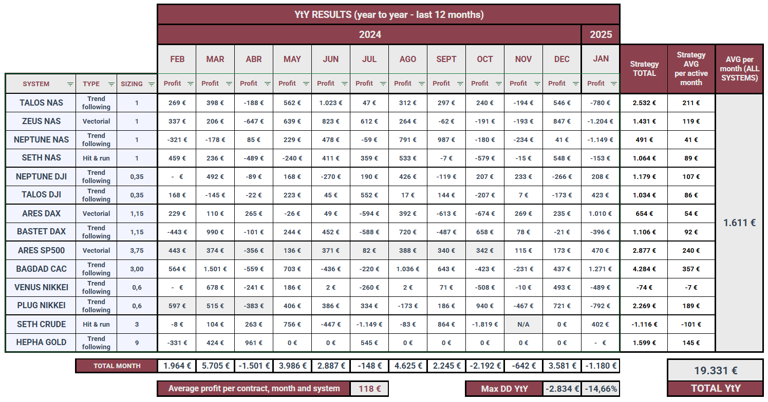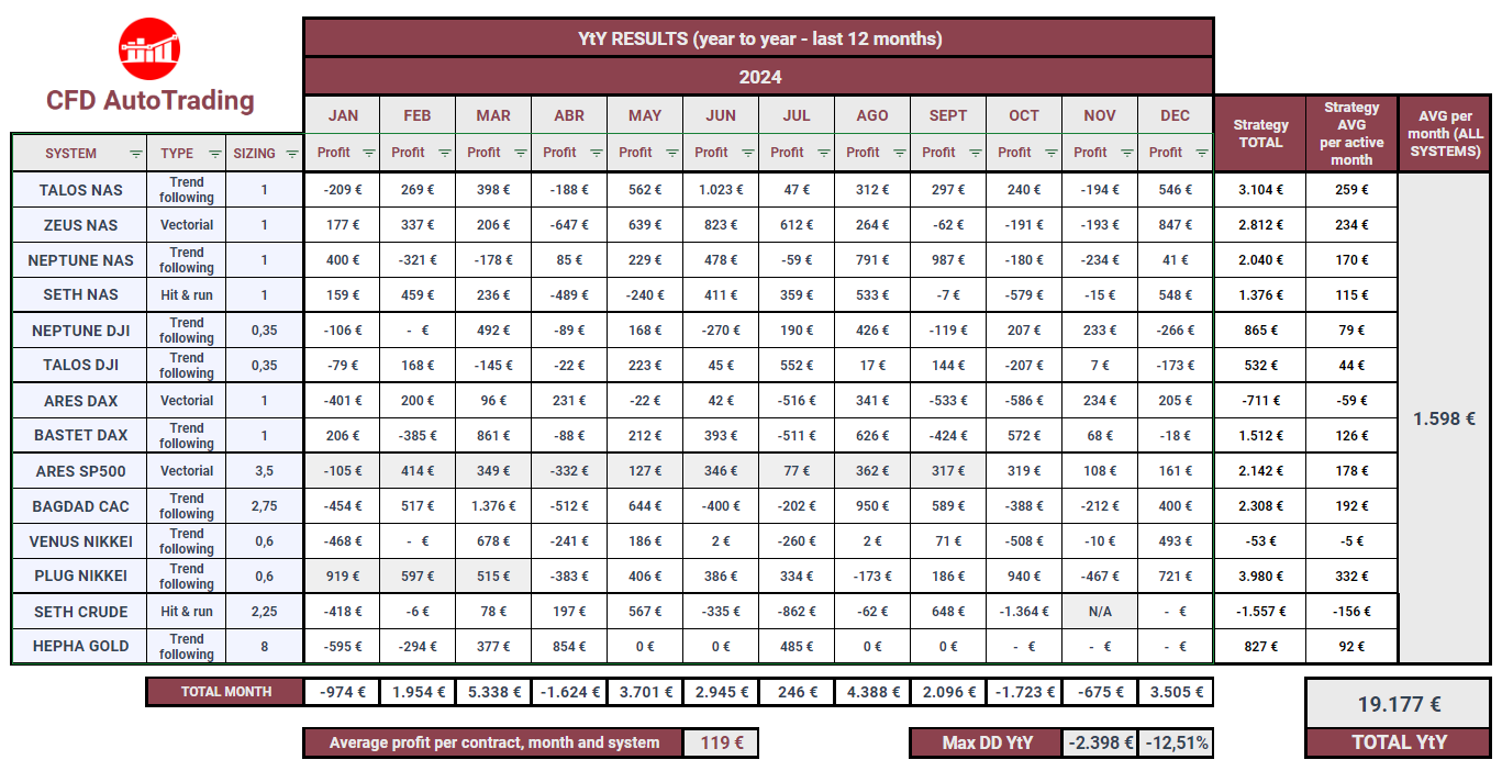 But in the other hand, two systems delivered outstanding results. ARES DAX and BAGDAD CAC both achieved great profits (with an awesome nearly 1.500€ profit for BAGDAD CAC, emerging as our most profitable system in the last 12 months. These results highlight the benefits of diversification with good and different strategies.