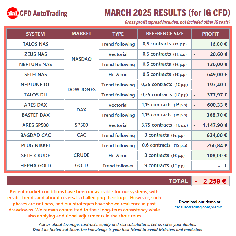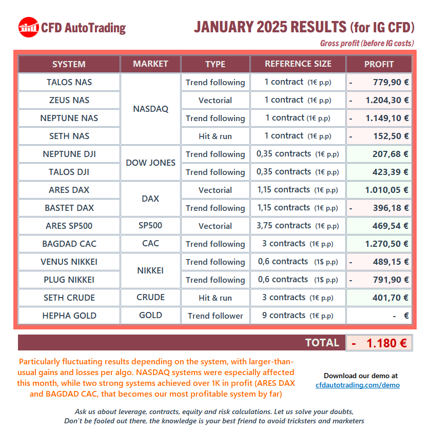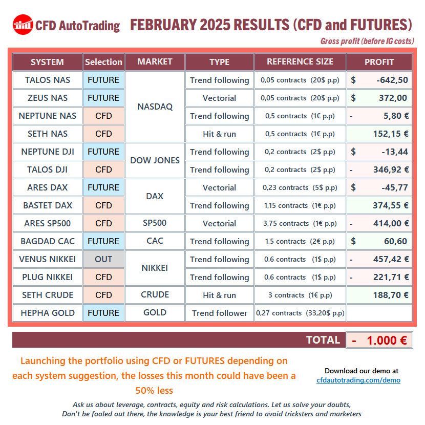 At the start of the month, we set 0.5 contracts as the default size for the NASDAQ systems in our proposed portfolio, until further notice. We also halted VENUS NIKKEI. More importantly, we’d like to highlight another key topic: the use of IG FUTURES. These instruments do not incur overnight costs and can be traded with the same margin requirements as CFDs. Essentially, IG FUTURES offer higher spreads but no overnight fees, making them an excellent option for swing trading with algorithms. For this reason, we are now including IG FUTURES results alongside our usual reporting.