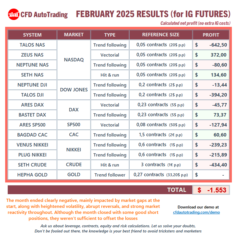 February continued in a similar way. This time, the losses were spread across all markets, with the exceptions of CRUDE, CAC40, and GOLD (the latter without any operations).