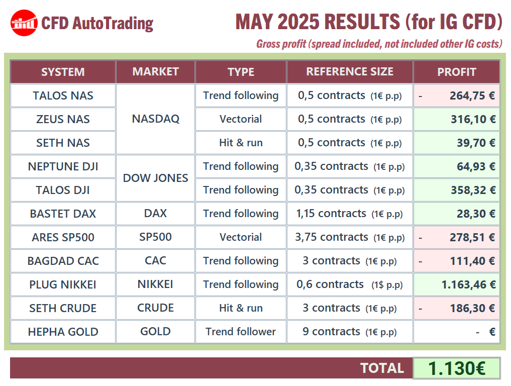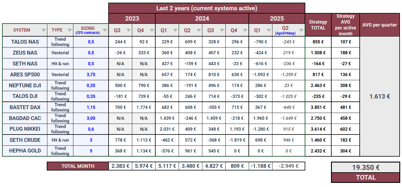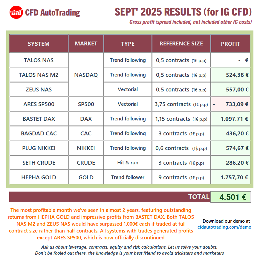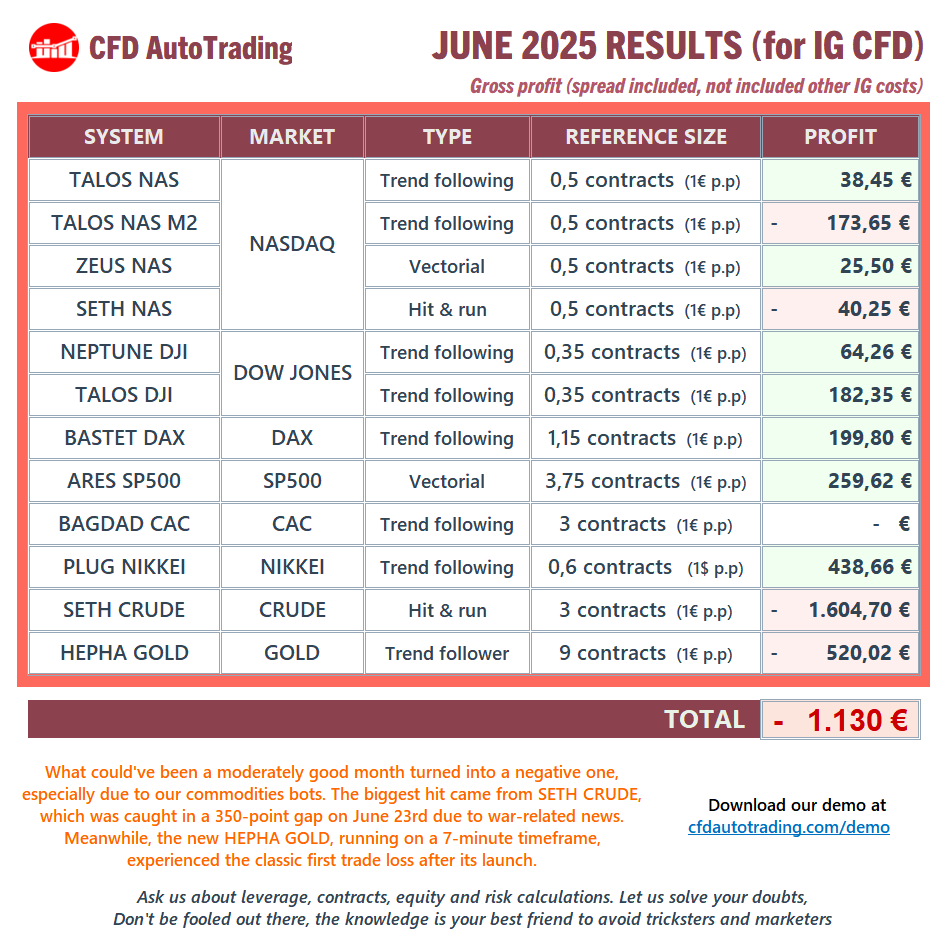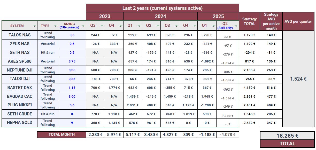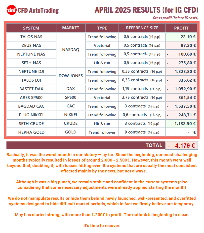 https://www.prorealcode.com/topic/cfd-autotrading-marketplace-vendor-questions-announcements-and-updates/page/3/#post-244887) we mentioned that we weren’t running all active systems live for various reasons. Since starting in 2020, we’ve been extracting results only from real instances, but it’s also true that for quite a few months (perhaps a year) we’ve drastically reduced the active instances in use on real accounts. And I say “active” because as I pointed out in that post, or as we openly explain in our groups or to those who ask us, beyond the current portfolio, we need to launch future versions and tests to validate them in real trading. Additionally, this multiplies numerous robots with their variants, using IG CFD, IG FUTURES, standard FUTURES in a few cases (we’re also IBKR AutoTrading)… not to mention a decapitalization I personally made last year, with other ongoing businesses (including robots for another platform which we haven’t wanted to publish/relate). All together we could need a huge amount of money.