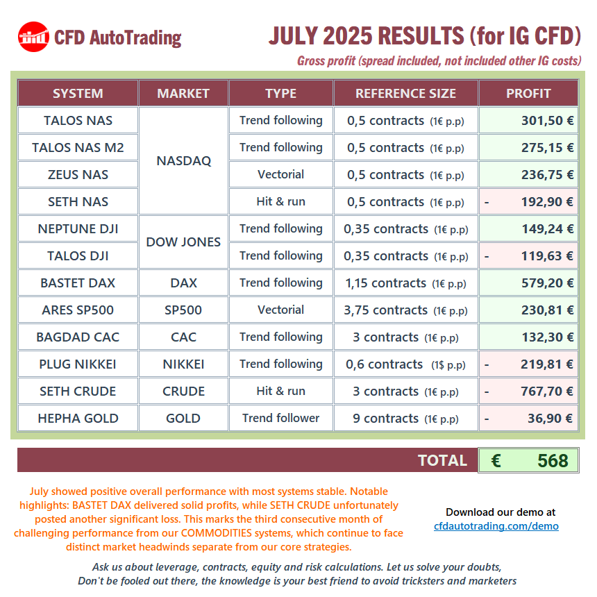 – So… in the IG FUTURES results, barring error and understanding they’re approximate (ignoring currency), the size per system is indeed approximate, except for NASDAQ, which is double. And, coincidentally, this month it’s in NASDAQ where IG FUTURES have performed worse than CFD (less profit even with double weight); but in almost all other systems the gains have been higher. Therefore, IG FUTURES have indeed performed better on July.