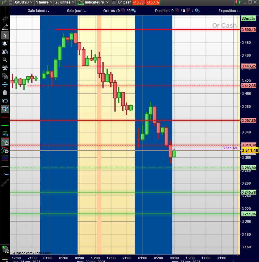 Cela dépend de la position de la bougie actuelle par rapport au niveau calculé. Si la bougie est au-dessus, la couleur des lignes est verte (support), et si la bougie est en dessous, la couleur sera rouge (résistance).