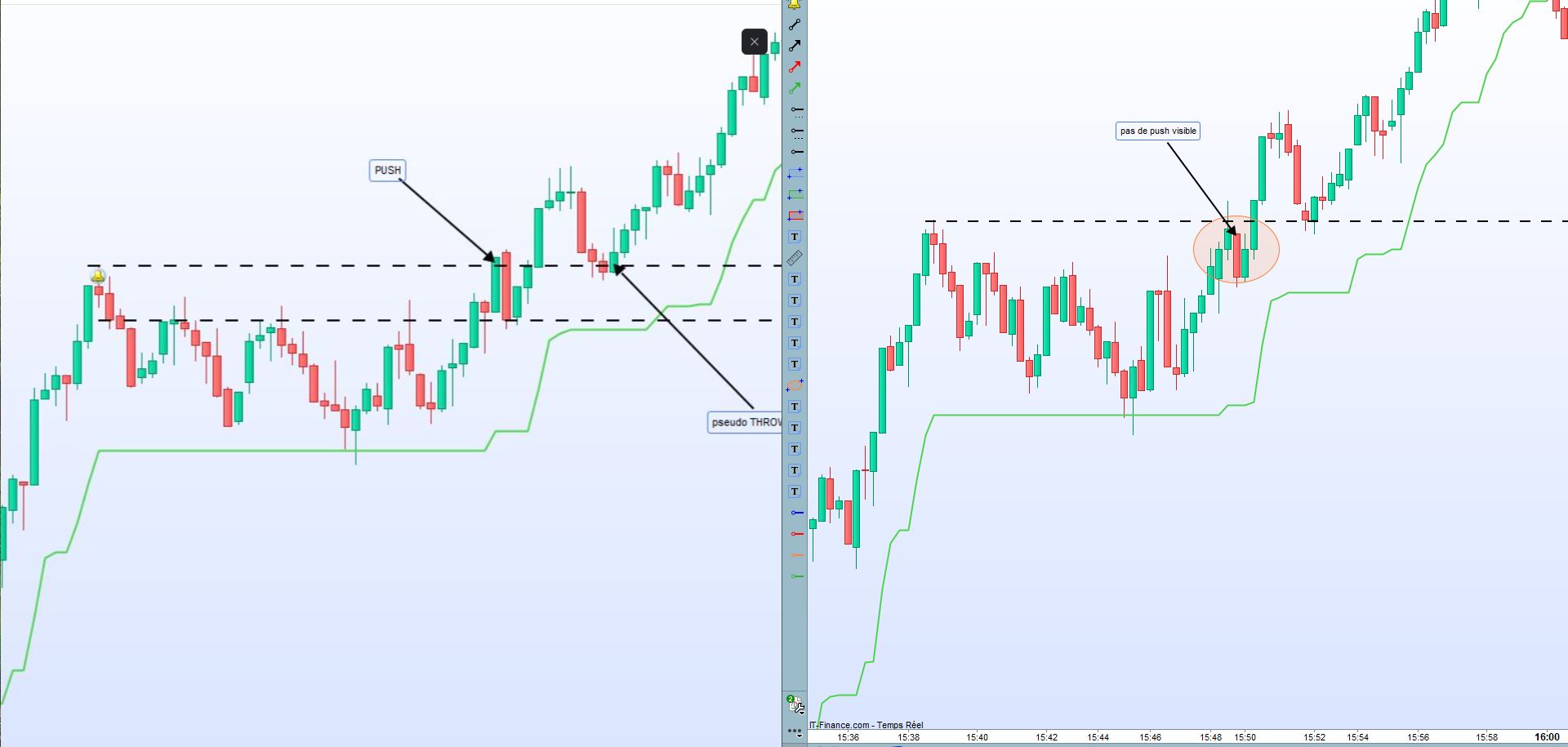Dans l’image ci dessous vous verrez un graph sur le DJ en 100 ticks. Sur la gauche le screen que j’ai fais hier pendant la séance vers 16h00 ou on voit un un set up de push bien visible (bougie d’impulsion, bougie d’hésitation pour avalement haussier).