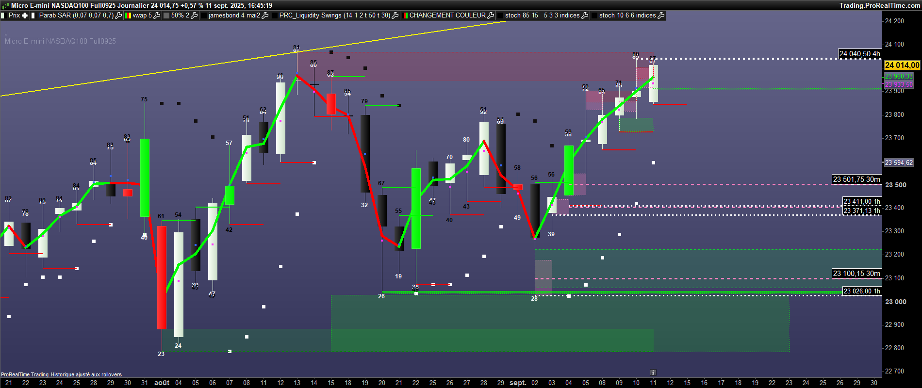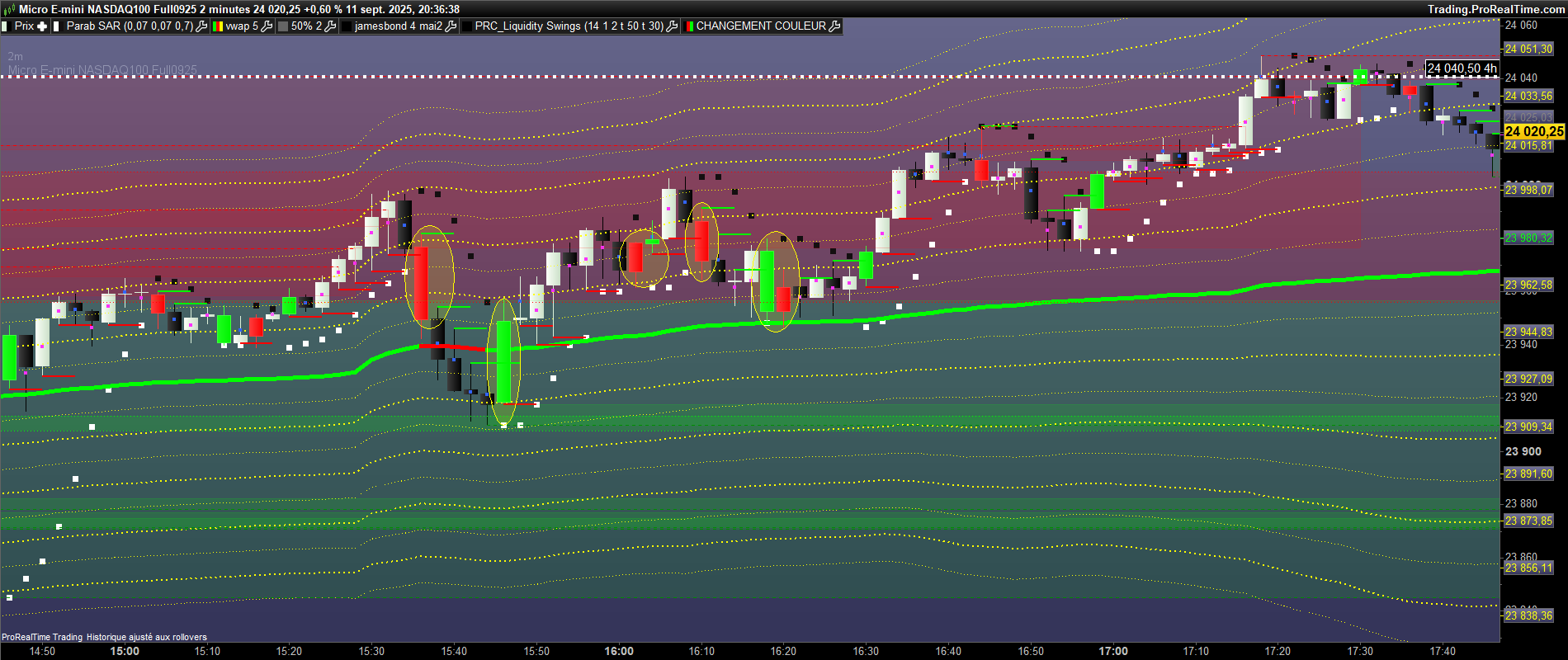 Merci Roberto pour cette modification de la couleur des bougies quand le setup numero 2 de cette stratégie est déclenché. Serait il possible de placer des traits vert/rouge sur le haut/bas de ces bougies signal comme sur le set up numero 1. Voici quelques graphiques d’explication.Merci d’avance Roberto .
