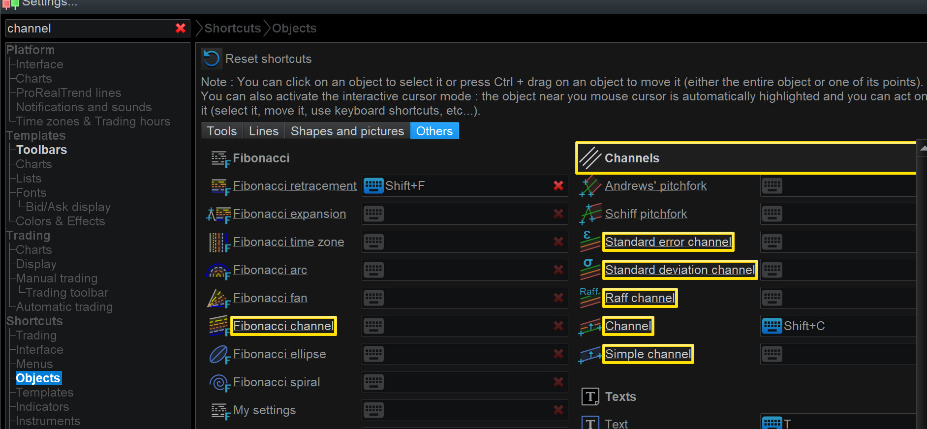 - To create a channel (using a D chart) in the beginning you can use Objects – channel – channel (that has ctrl C besides it)