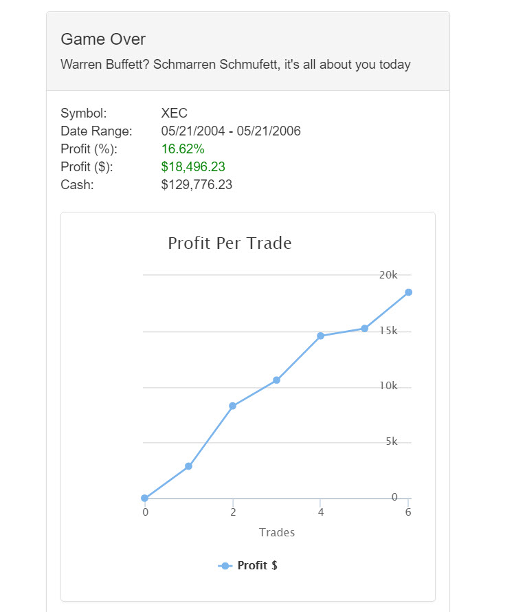 Played my first full game. Still seems a bit easy! Not a single losing trade but 10.65% profit over two years is not much to jump up and down about.