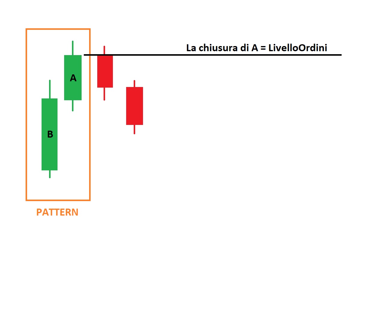 In realtà vorrei che ad ogni volta che si crea un patter, come illustrato nell’immagine, la Chiusura della CandleA venga identificato come livello o valore fisso.