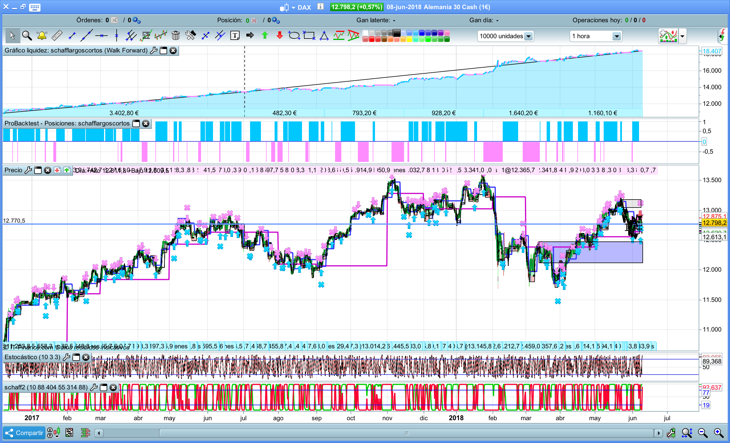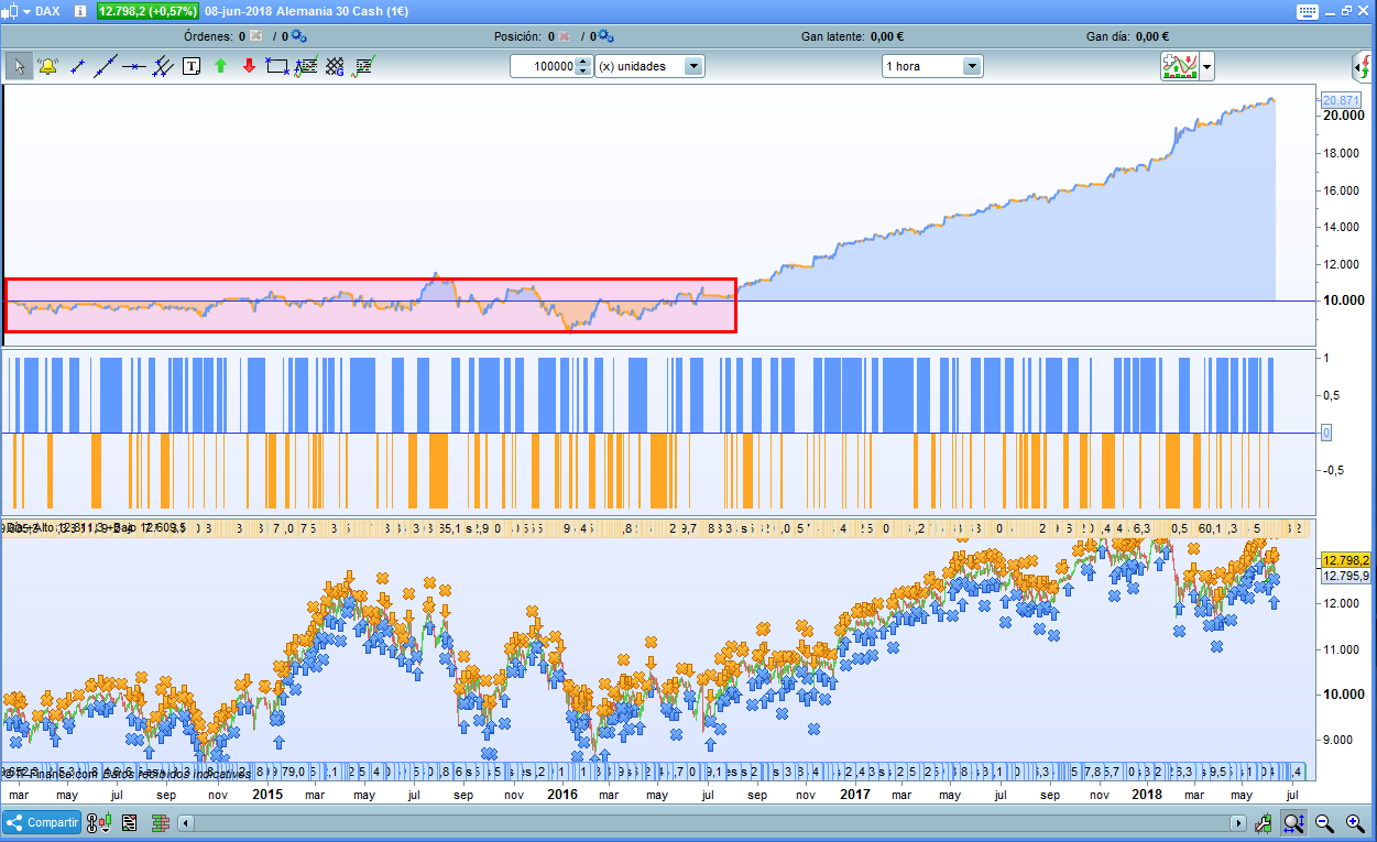 En primer lugar gracias por compartir.He analizado su sistema con sus mismas variables y sólo es rentable a partir de noviembre de 2016.Fíjese en el rectángulo rojo de la imagen es totalmente plano…………Hay un montón de sistemas que son muy buenos durante un año,lo difícil es conseguir que sean rentables durante 5 ó 10 años.Un saludo.