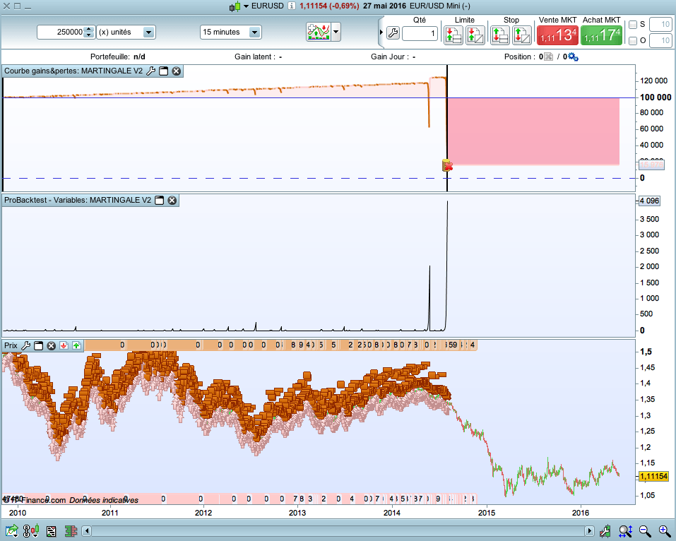 Here is a typical example of a capital increase of curve with a strategy that follows a martingale.