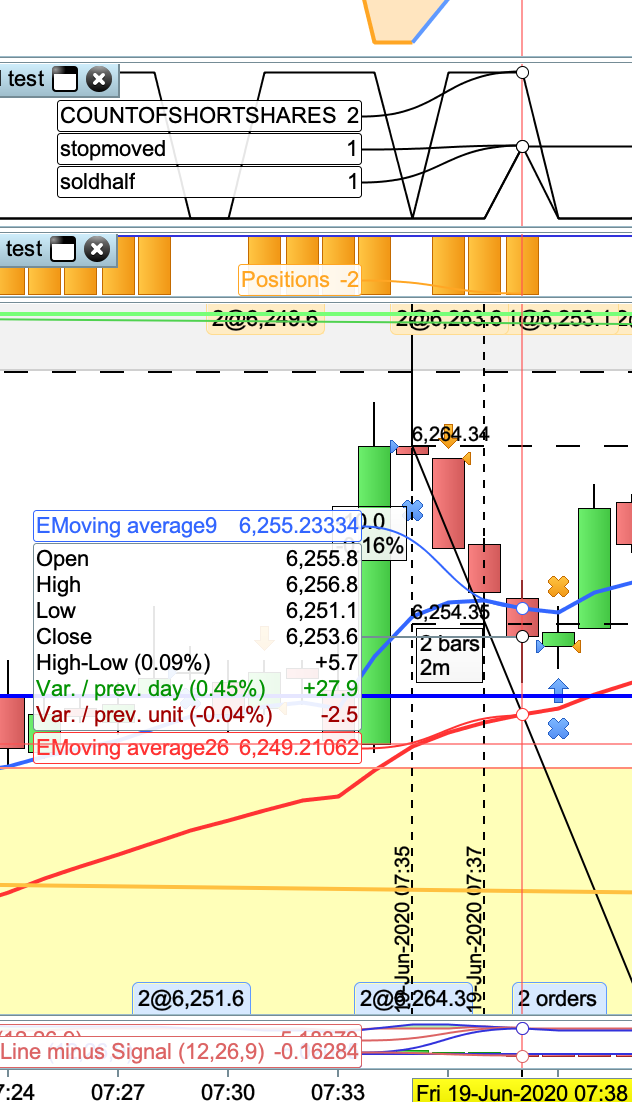 My screenshot shows that the code runs; Stopmoved = 1 and Soldhalf = 1, but there is no indication that the buy is executed and COUNTOFSHARES never changes to 1.