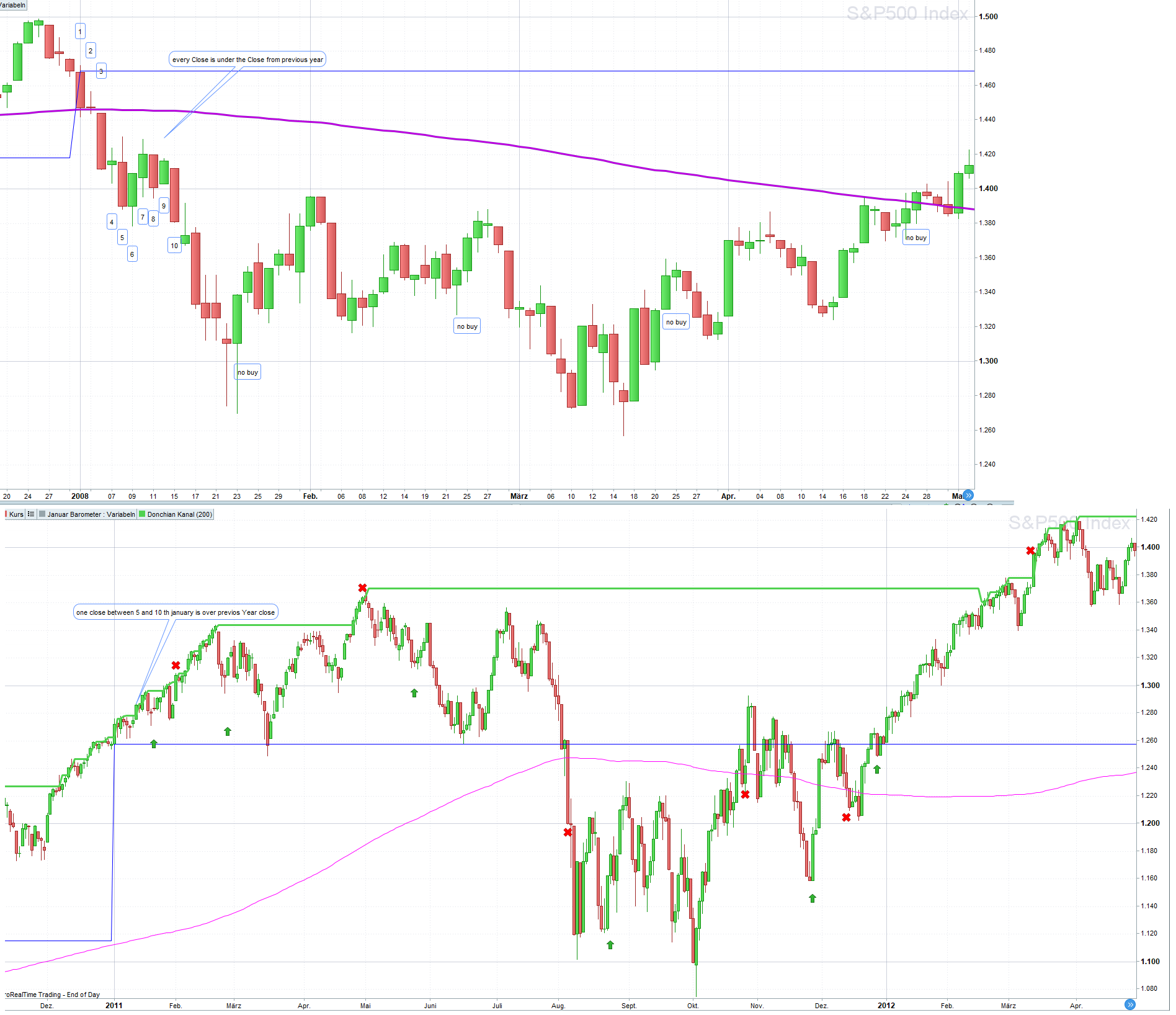 Year 2008: No close between 5th and 10 th january is higher than previous year close –> so in this year is no entry on every 25. of each month if not on the market. The january barometer say no good long year