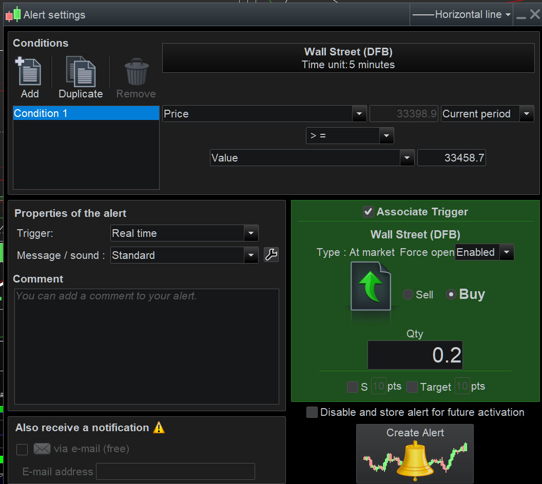 Hi bearbull, if you have access to V12 with your account/broker you can link an order (Limit, Stop, Market,…) to an alert at the bottom of the alert window, which you can set up to trigger on a price level, or a line, or an indicator, etc.