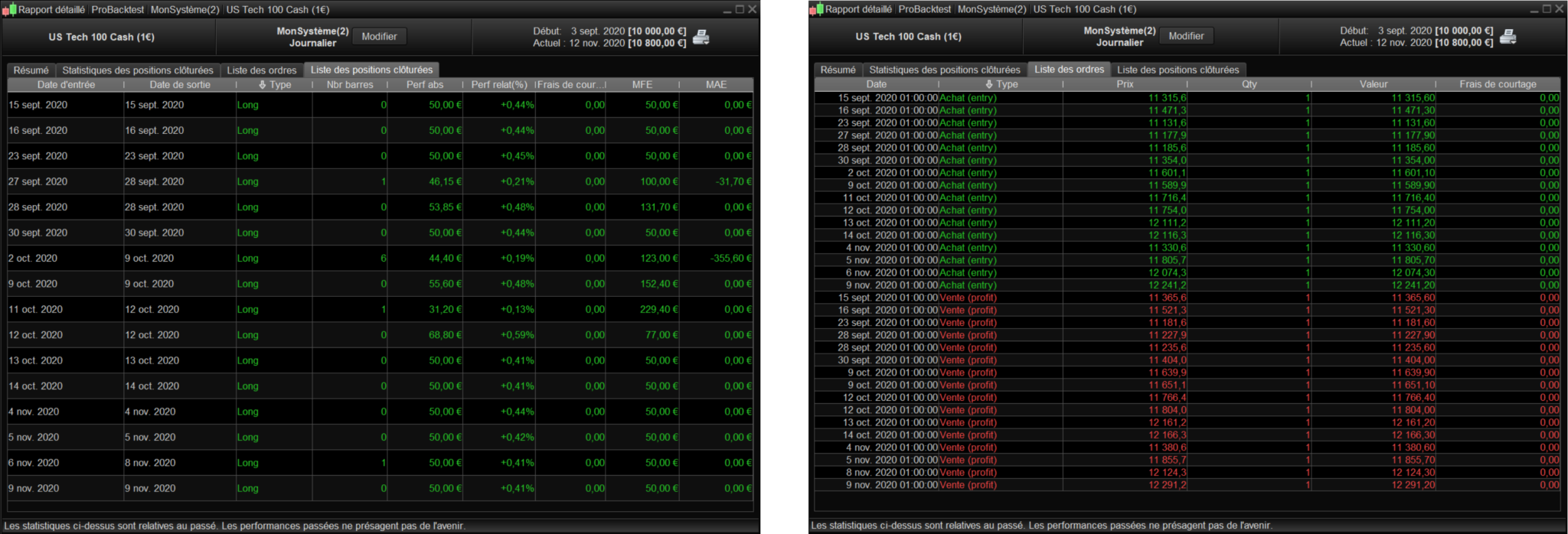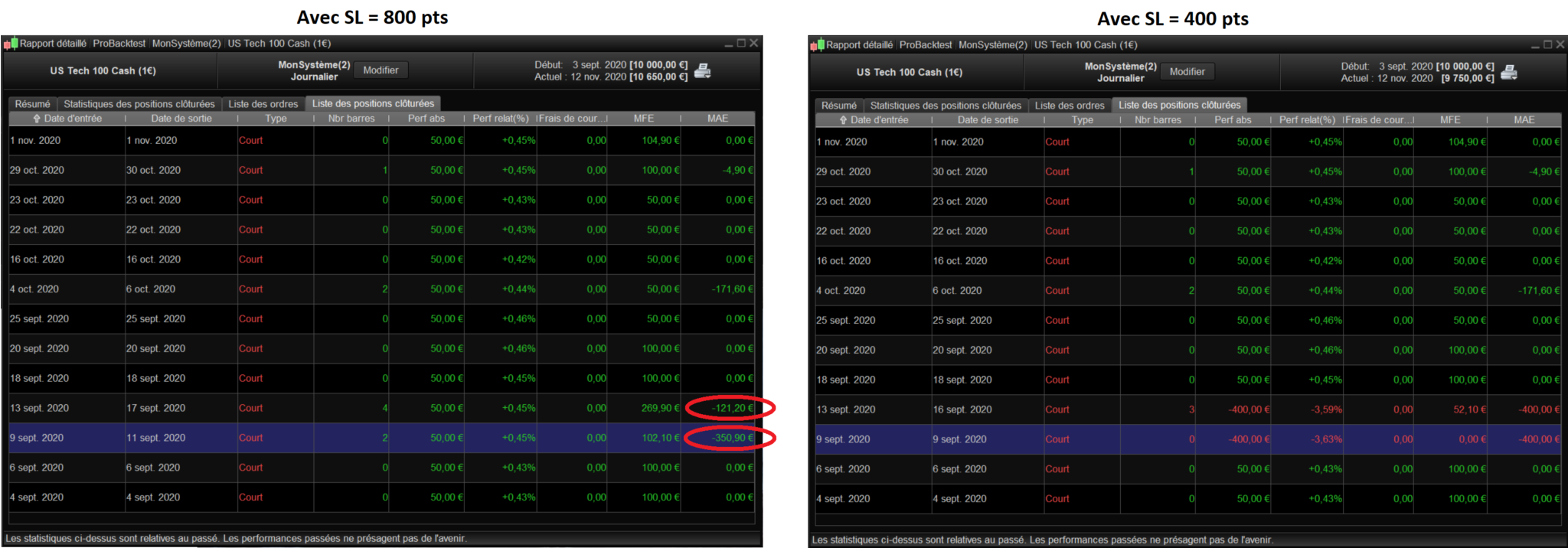 Avec 800 pts de SL, toutes les positions sont gagnantes. Le pire MAE est de -350,90€ pour la position du 09/09. En mettant le SL à 400 pts je m’attendais à avoir le même résultat (-400€ > -350,90€). Avec ce SL à 400 pts, deux positions sont stoppées. Ca m’étonne car leur MAE etait inférieures au SL.