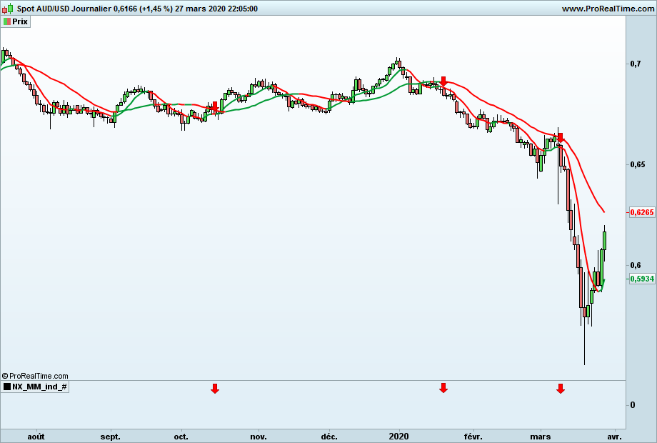 Re-bonjour Nicolas, J’ai testé les 2 codes, le screener et l’indicateur : ils marchent parfaitement sur tous les instruments sur lesquels je les ai testés. Je l’ai fait en journalier et intraday pour le screener … De même l’indicateur marche aussi parfaitement (voir graphique image AudUsd, la position des flèches, que j’ai déplacées et mises sur les cours) Il marche sur les indices index, future, matières 1ères et actions….
