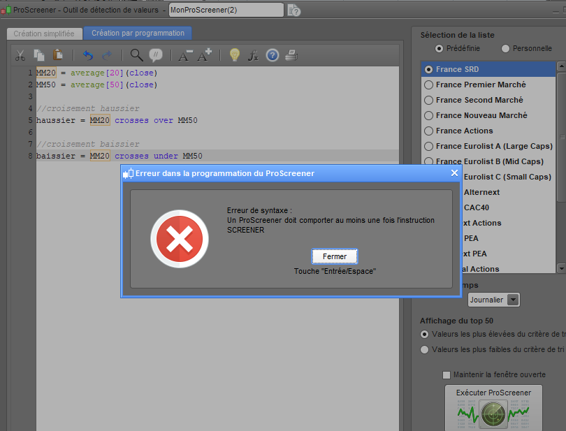 Bonjour Nicolas, j’ai un petit soucis pour le code du croisement mm20 et mm50.quand je vais dans proscreener et que je fais un copier coller du programme: